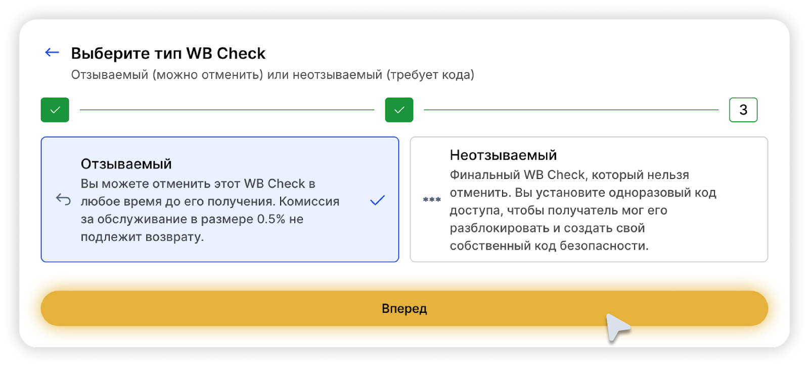 Обратите внимание: после подтверждения с отправителя будет взиматься комиссия за услуги создания WB Check. Эта комиссия не подлежит возврату, даже если чек WB отменен или деактивирован.