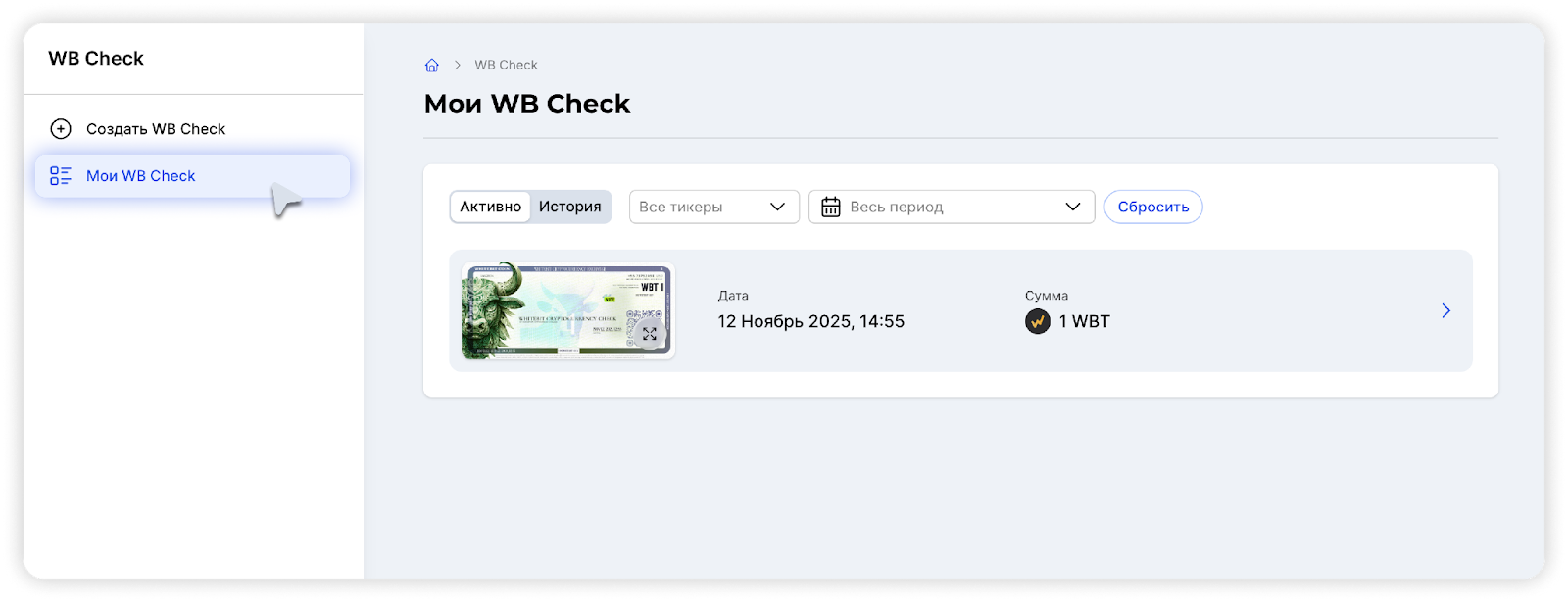 7 - После подтверждения ваш созданный WB Check будет отображаться в секции “Активные” в разделе "Мои WB Check".