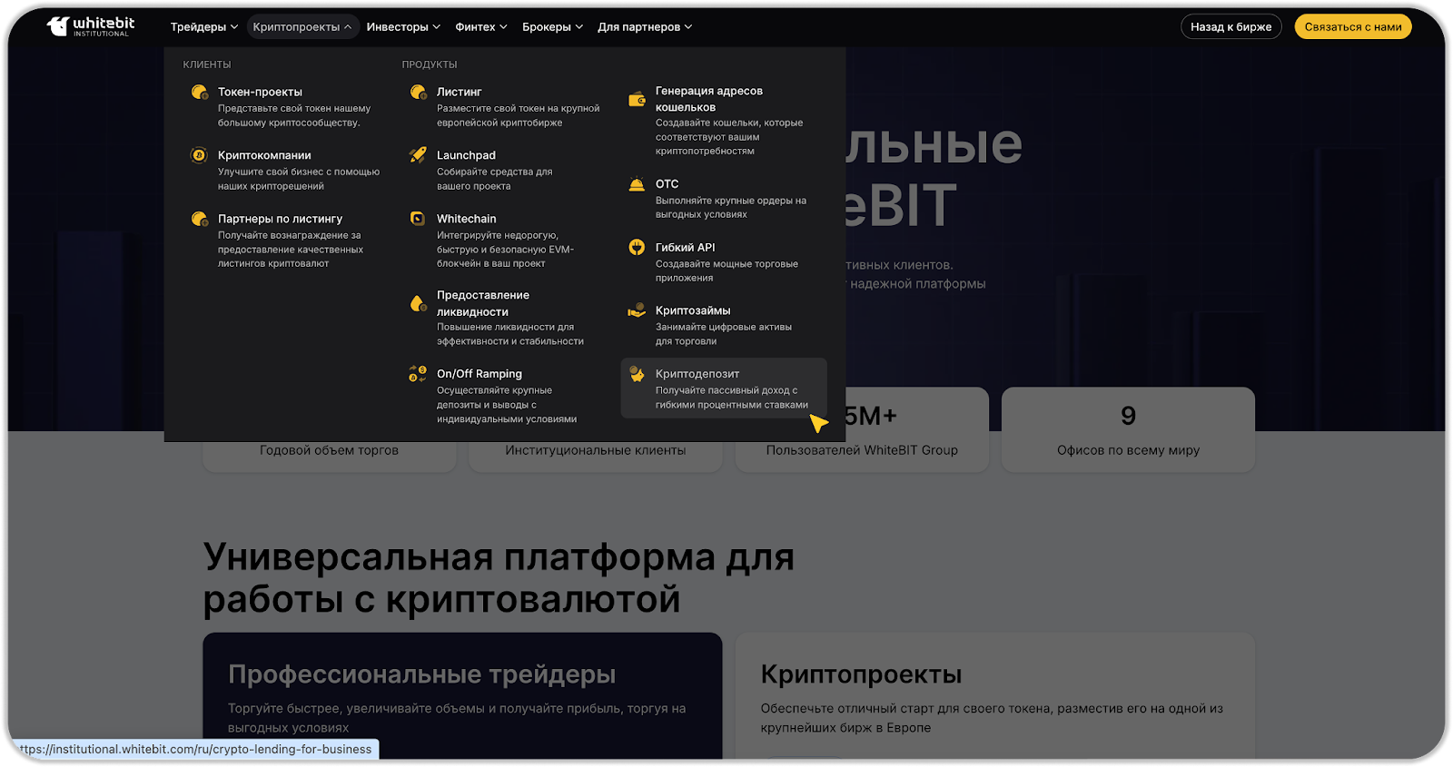 Криптодепозит для институциональных клиентов считается безопасным, поскольку бизнесы сотрудничают с авторитетными и регулируемыми платформами. WhiteBIT применяет надежные меры безопасности.