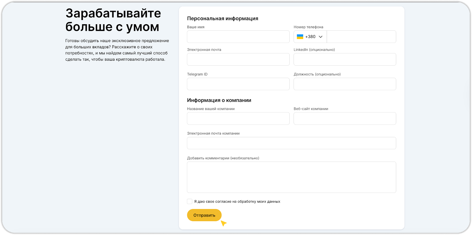 Криптодепозит для бизнеса позволяет получить больше инвестиций с помощью одного из высокодоходных планов, разработанных для быстроразвивающихся компаний. Криптодепозит позволяет компаниям вкладывать свои криптовалютные активы. Таким образом компании могут получать проценты от своих вложений. Это предложение позволяет компаниям эффективно управлять своими активами и использовать потенциал роста рынка.