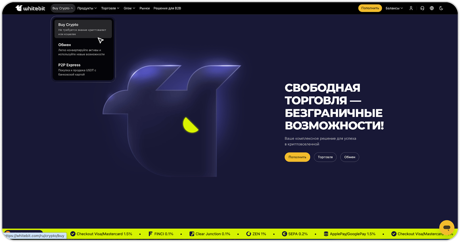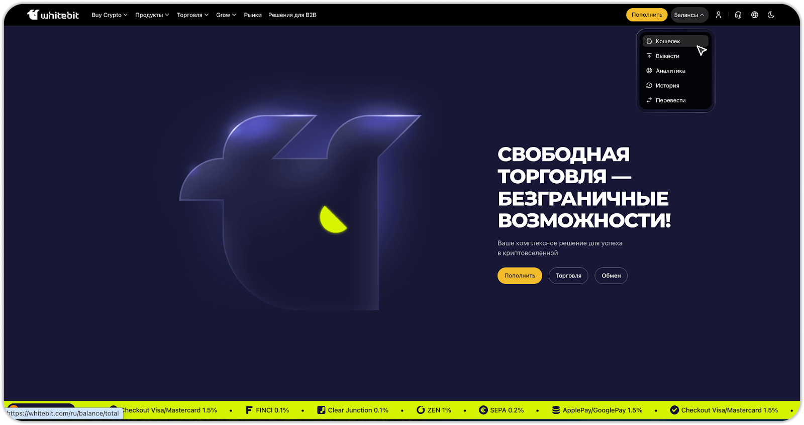 - Пополнение через Checkout Visa/Mastercard на сайте WhiteBIT