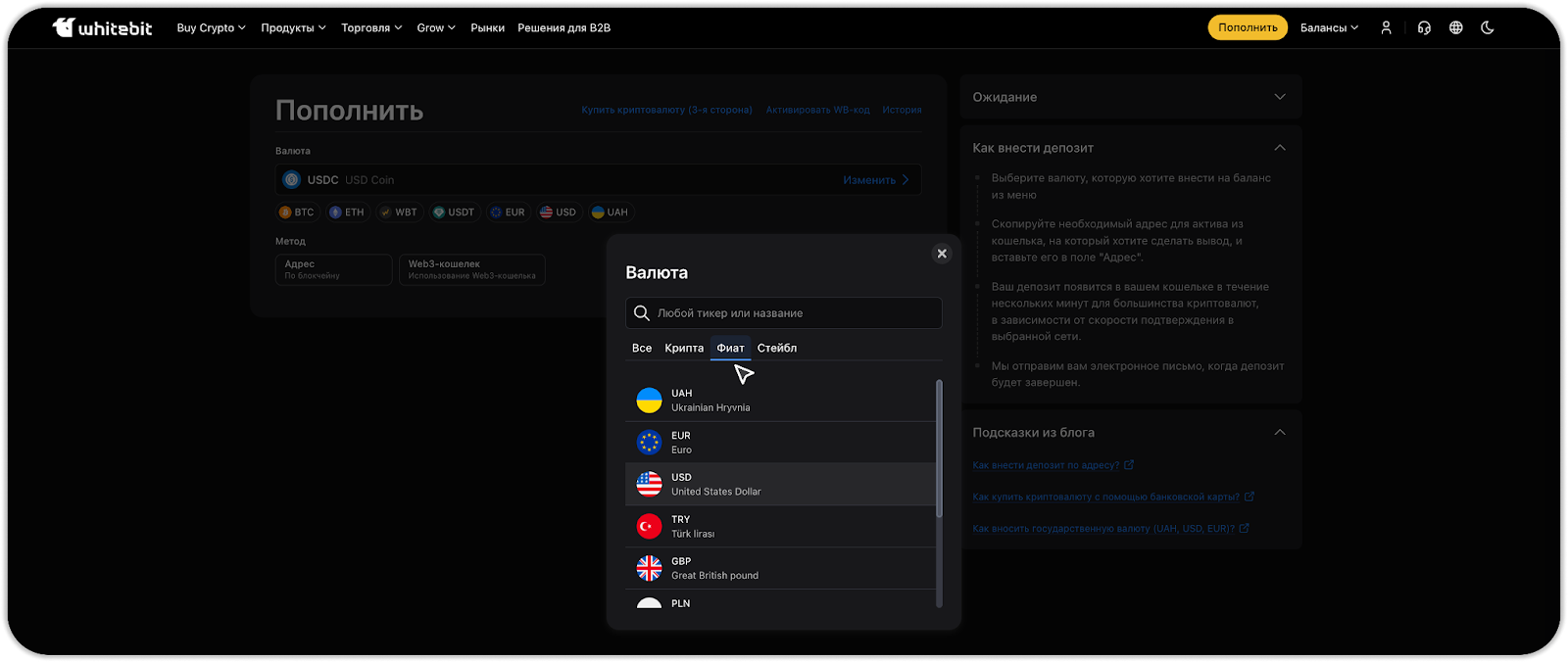 На WhiteBIT доступны следующие методы пополнения: