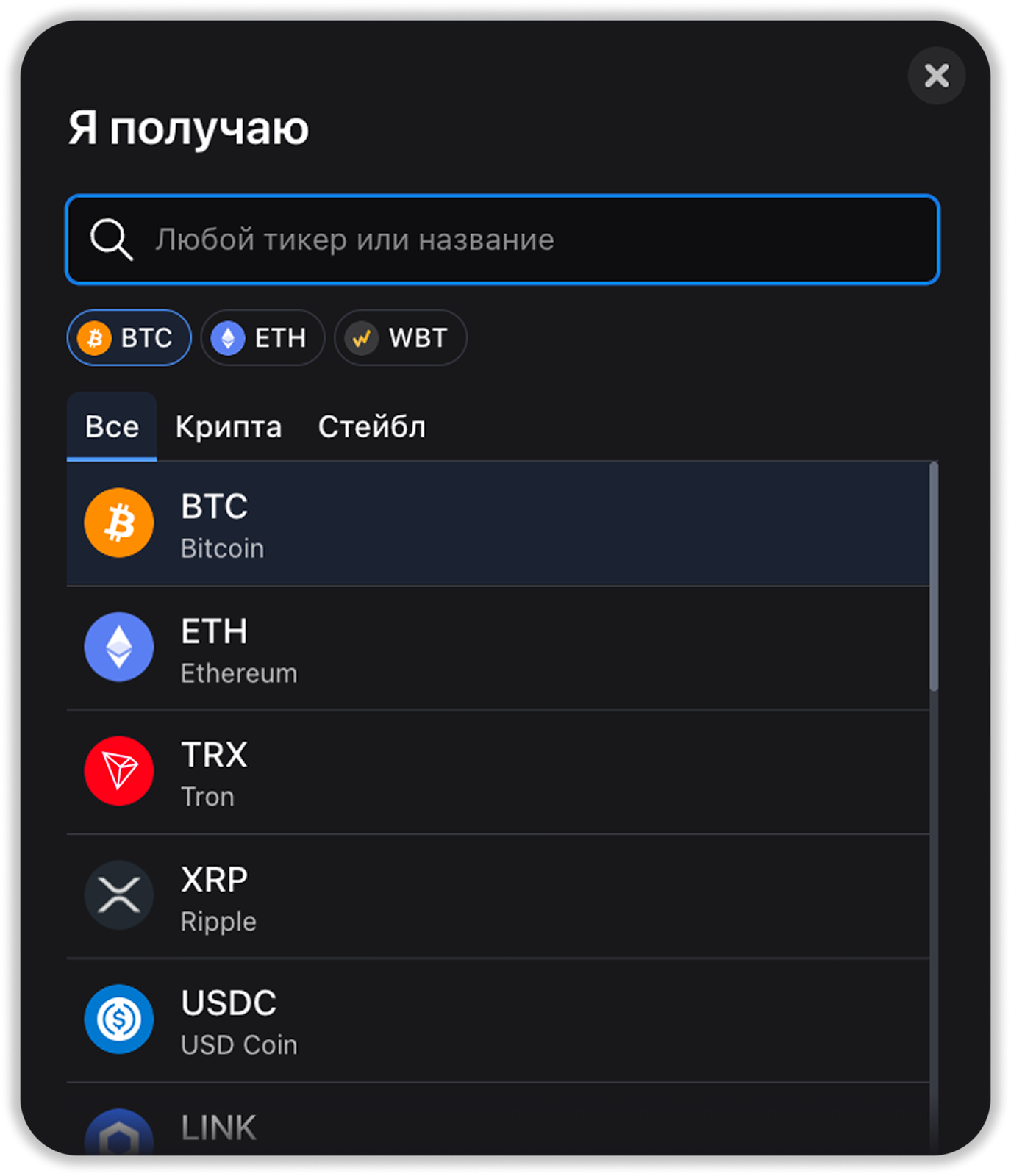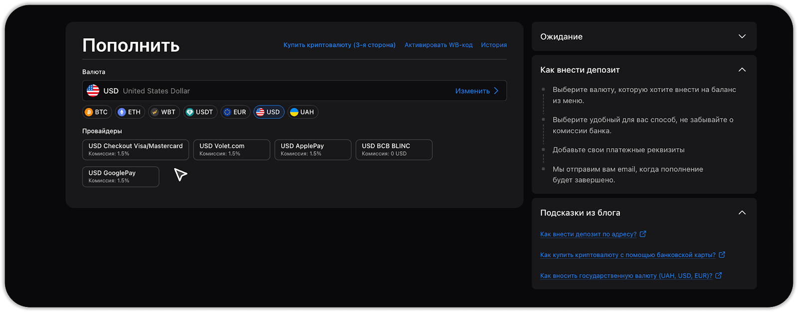 - Депозит фиатной валюты (банковские карты и платёжные провайдеры);