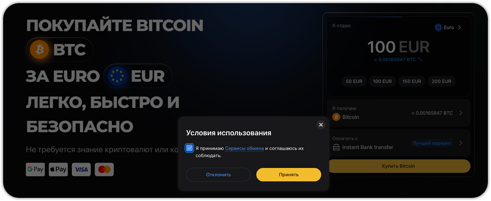- Выберите способ оплаты (Google Pay / Apple Pay или карта Visa/Mastercard).