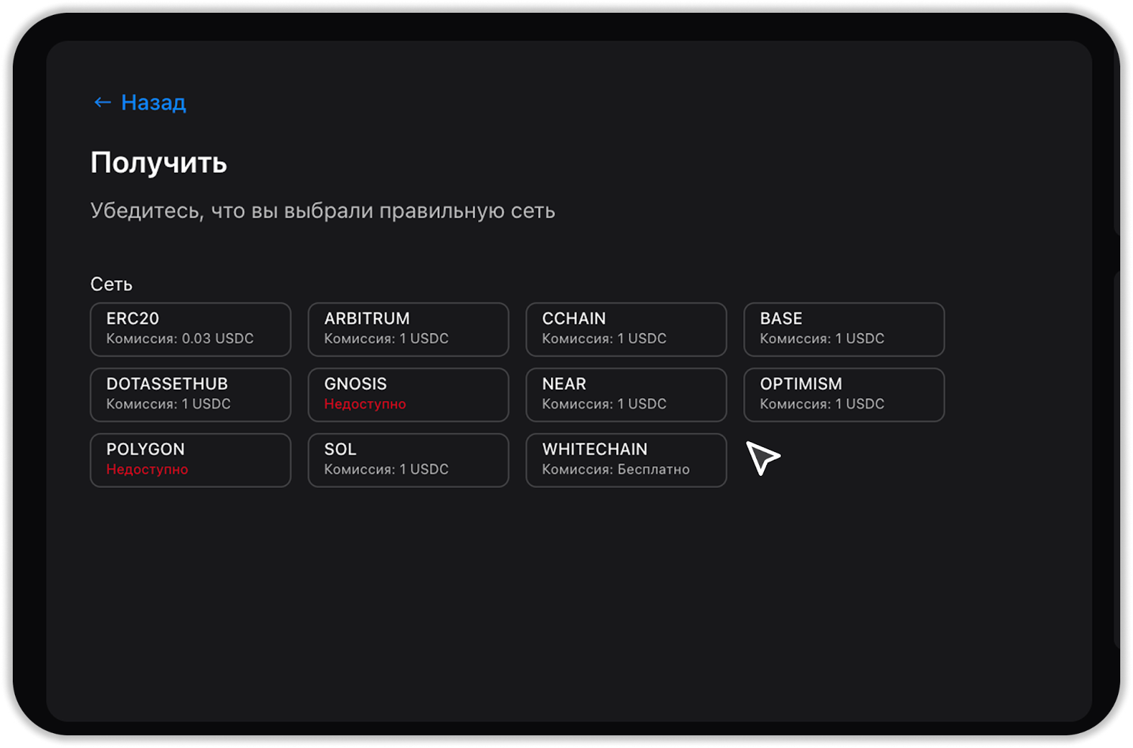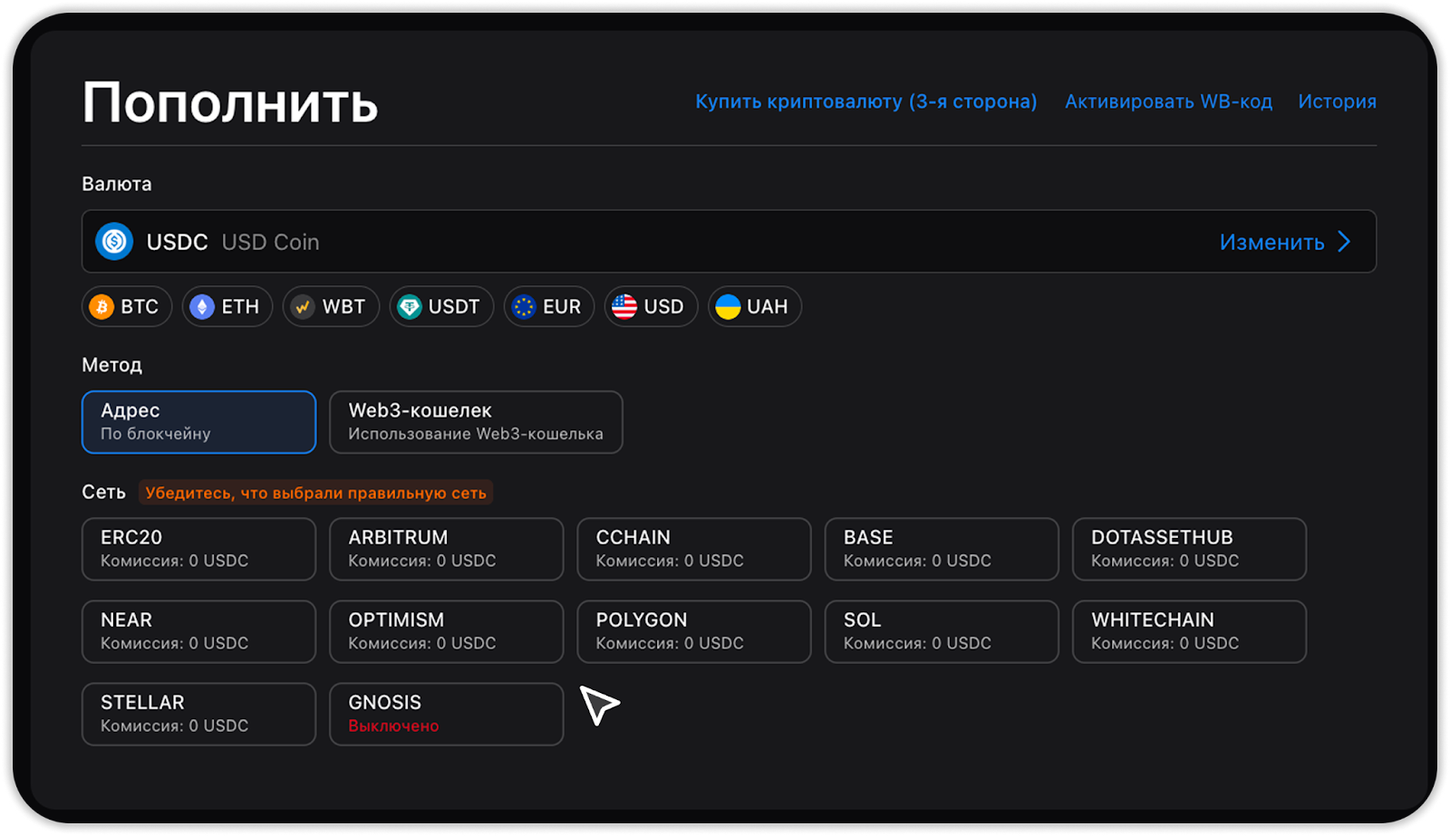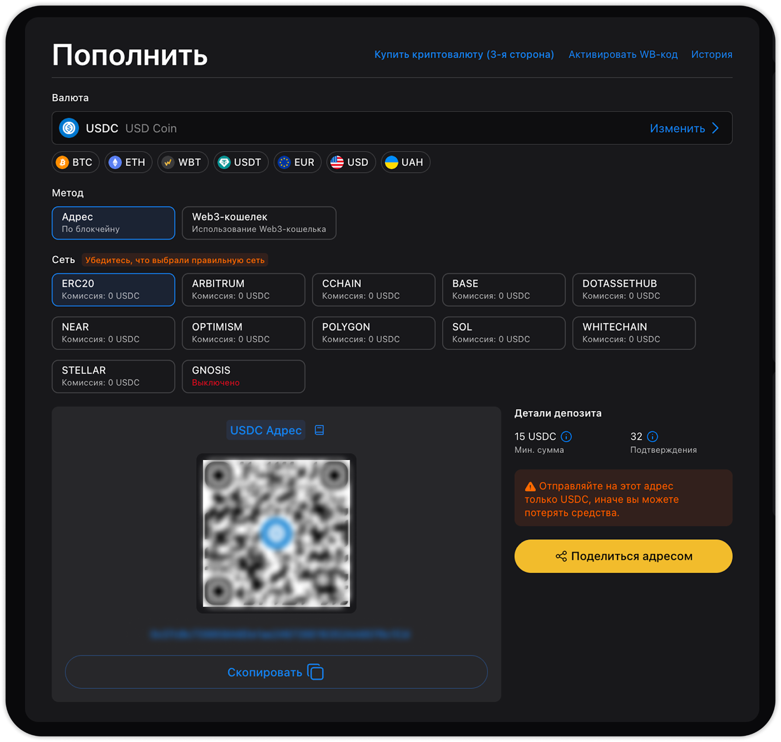 Обратите внимание: всегда выбирайте правильную сеть и проверяйте адрес перед отправкой средств. Все комиссии и лимиты при пополнении криптовалюты отображаются на странице Комиссий.
