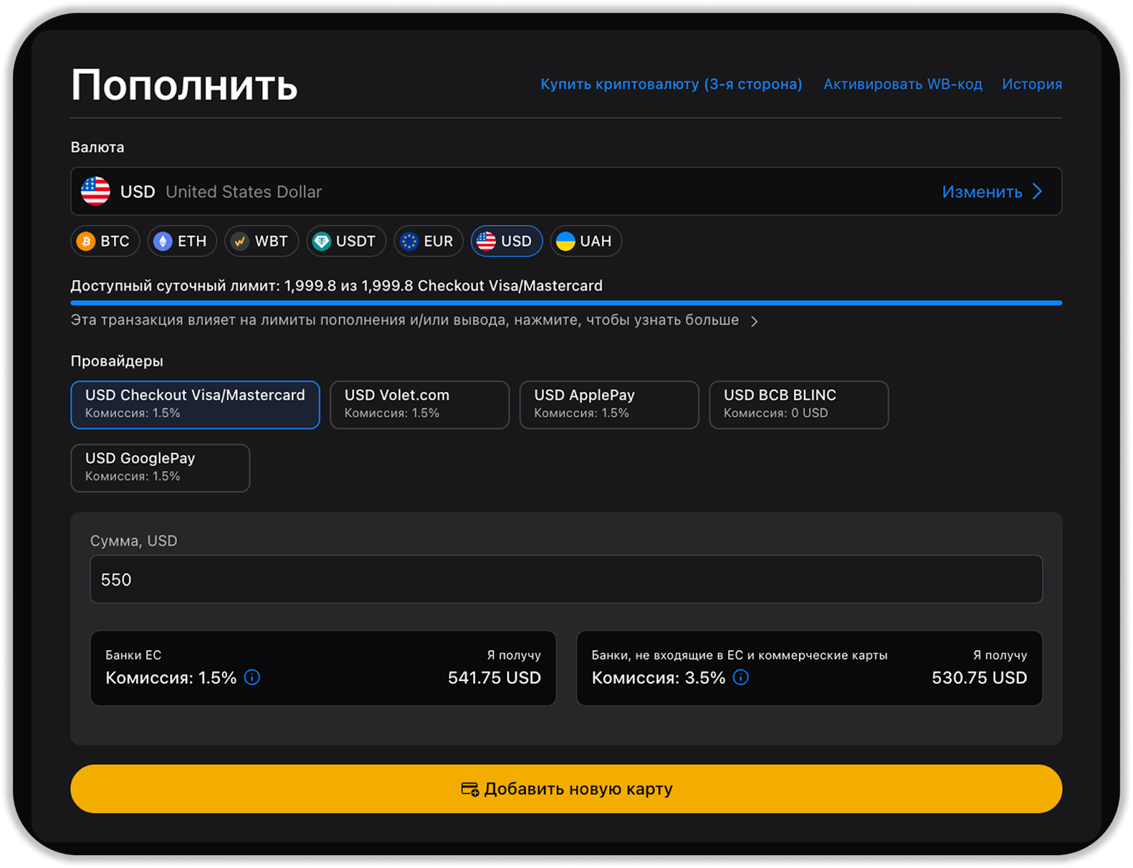 Обратите внимание: ознакомьтесь с дневными лимитами и итоговой суммой зачисления с учётом комиссии. Комиссия зависит от выбранного провайдера. Все комиссии и лимиты при пополнении фиатной валюты отображаются на странице Комиссий.