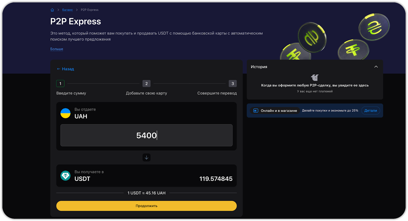- P2P Express (обмен USDT ↔ UAH);