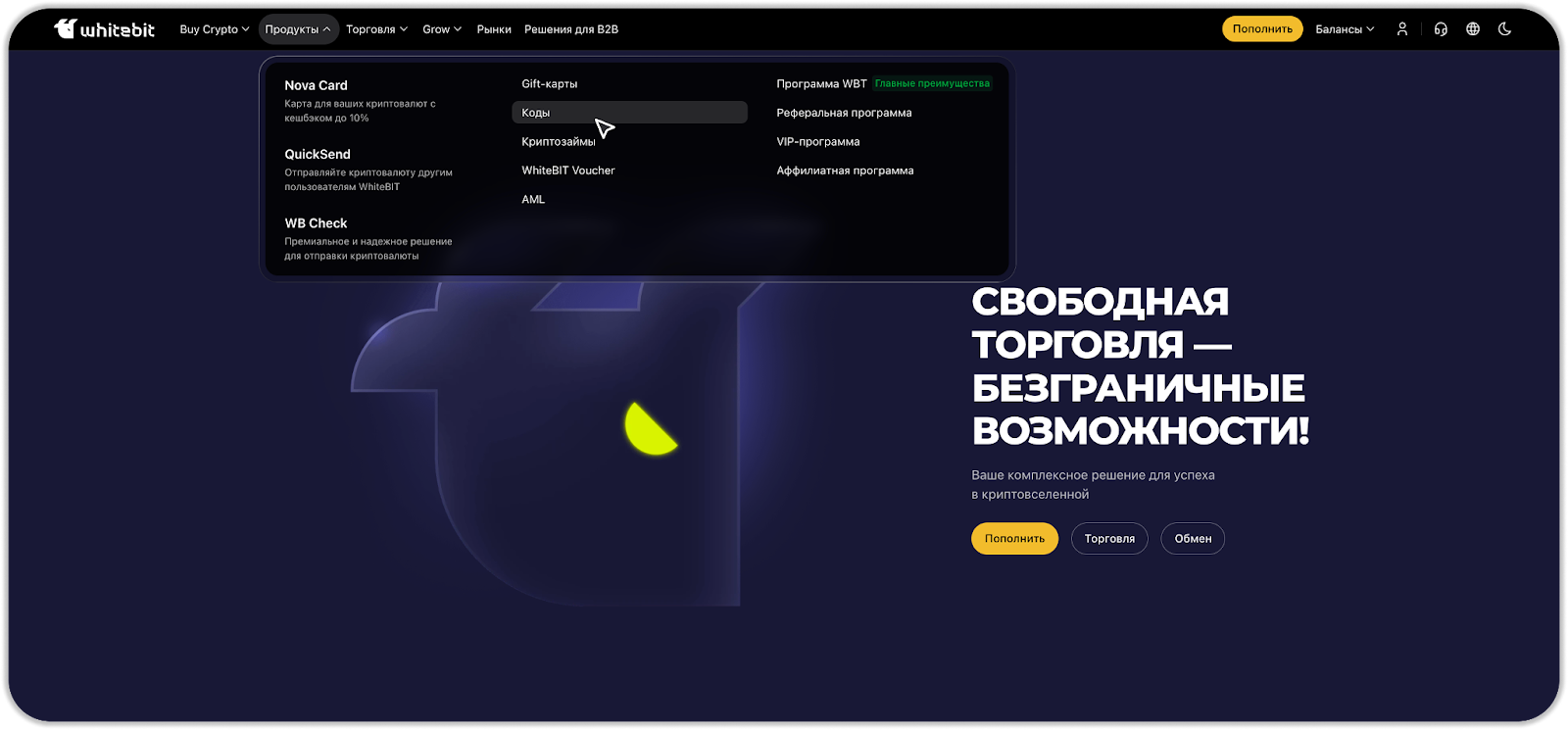 - Перейдите в раздел “Продукты” — “Коды” в веб-версии или “Продукты WhiteBIT” — “Финансы” и нажмите “Коды” в мобильном приложении.