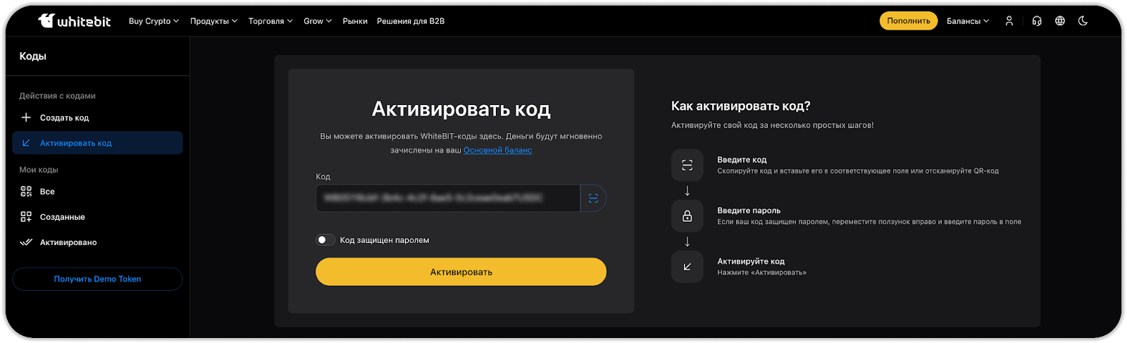 Это внутренний код для мгновенного перевода криптовалюты без комиссии между пользователями WhiteBIT. Как пополнить баланс с помощью кода WhiteBIT: