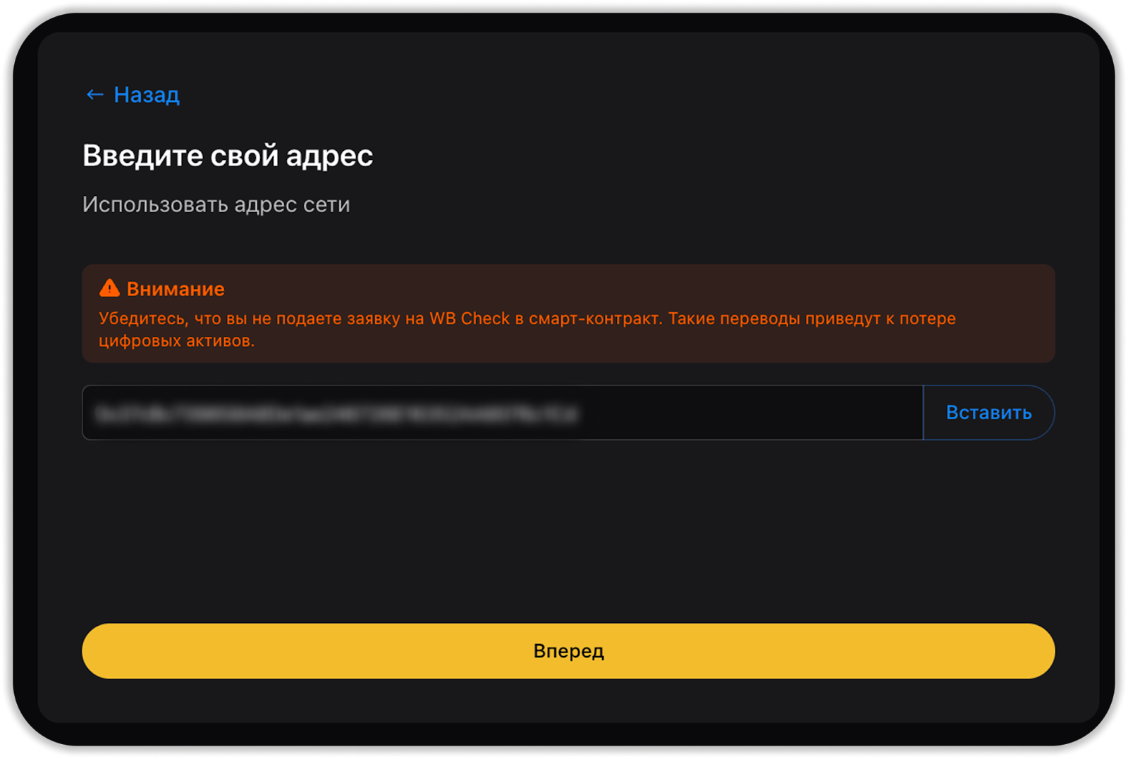 - Выберите сеть и введите адрес кошелька.