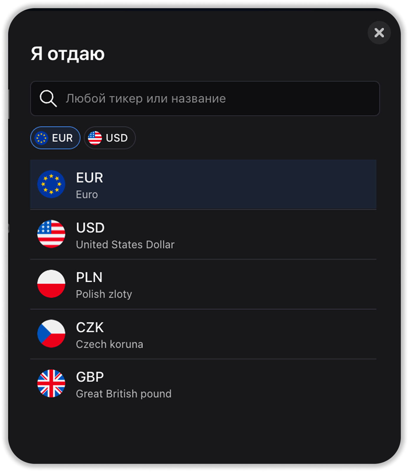 - Выберите фиатную валюту (EUR, USD, PLN, CZK, GBP) и криптовалюту.