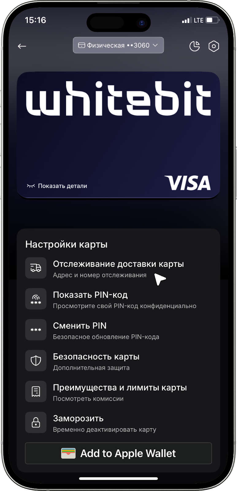 Если вы не получили карту в течение указанного срока доставки, сначала вам нужно заморозить физическую карту в ее настройках во вкладке с изображением карты. После этого свяжитесь с нашей службой поддержки (отправьте email на support@whitebit.com), детально опишите ваш запрос и предоставьте согласие на закрытие физической карты.