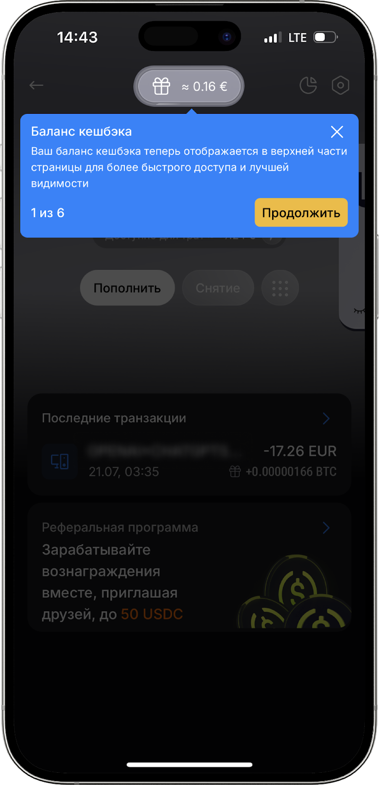 Баланс кэшбэка отображается в верхней части экрана в виде иконки подарка. Максимальный лимит кэшбэка составляет 25 EUR в месяц, но вы можете вывести его, когда накопите не менее 5 USDC. То есть, если вы достигли лимита кэшбэка даже в первый день, то он вам больше не будет начисляться до начала следующего месяца.