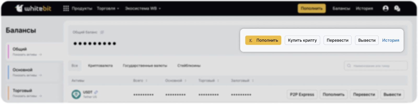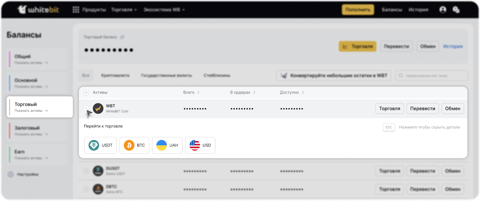 Основной баланс предназначен для пополнения и вывода криптовалюты и государственной валюты. Для валют с положительным балансом доступна возможность создать WhiteBIT-код и открыть планы Криптодепозита, не переходя специально в другие разделы (доступно только для тех монет/токенов, по которым есть возможность открыть план). Также на этой странице вы можете перевести ваши WBT в Holding.