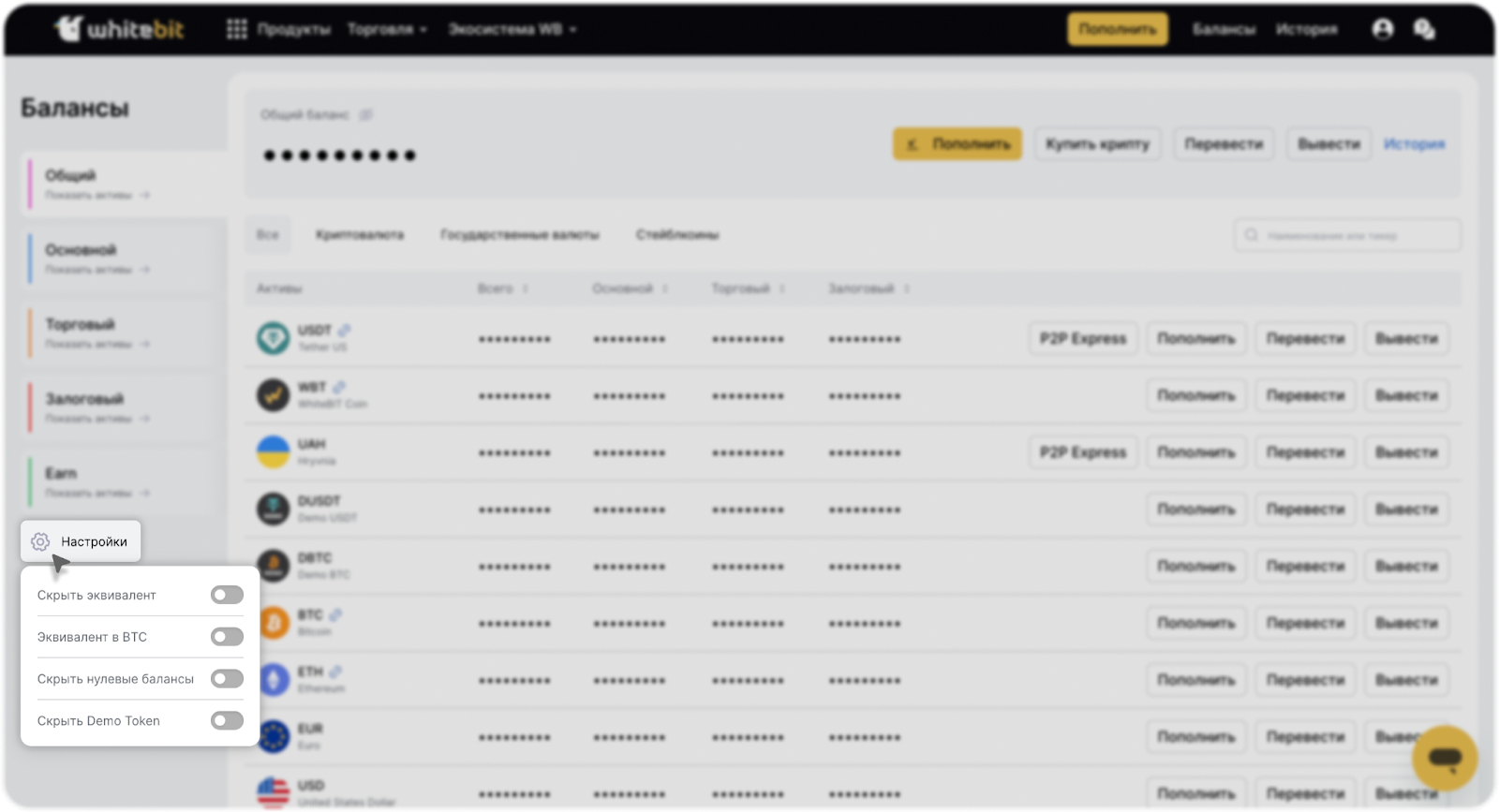 После регистрации на бирже WhiteBIT каждому пользователю доступны 5 страниц баланса: Общий, Основной, Торговый, Залоговый и Earn баланс. Чтобы ознакомиться с функционалом каждого из них, необходимо перейти в раздел Балансы в правом углу верхней панели на главной странице биржи.