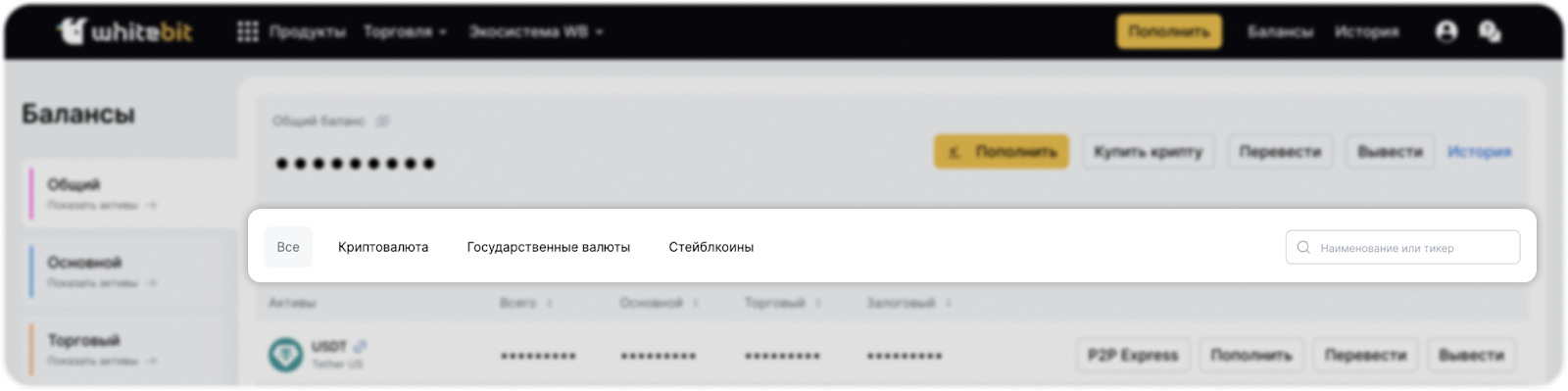 На страницах Общего, Основного и Торгового балансов есть возможность отфильтровать необходимые вам активы - Все, Криптовалюта, Государственные валюты и Стейблкоины. Такую же панель вы увидите на странице Залогового баланса, однако без раздела Государственные валюты.