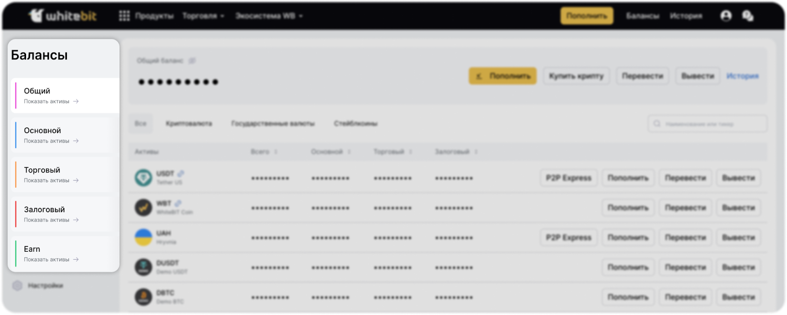 После регистрации на бирже WhiteBIT каждому пользователю доступны 5 страниц баланса: Общий, Основной, Торговый, Залоговый и Earn баланс. Чтобы ознакомиться с функционалом каждого из них, необходимо перейти в раздел “Балансы - Кошелек” в правом углу верхней панели на главной странице биржи.