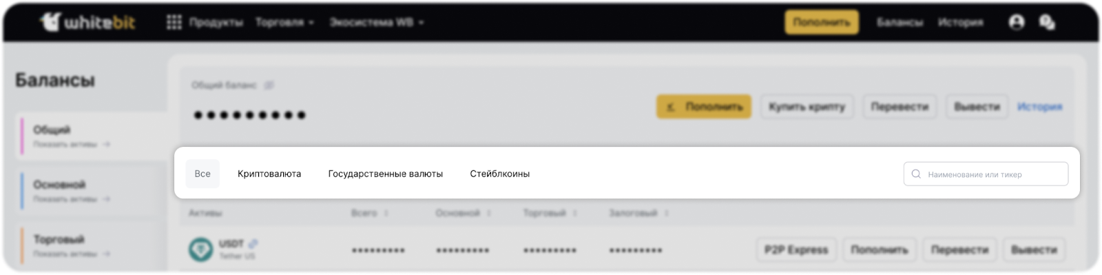 На страницах Общего, Основного и Торгового балансов есть возможность отфильтровать необходимые вам активы - Все, Криптовалюта, Фиат и Стейблкоины. Такую же панель вы увидите на странице Залогового баланса, однако без раздела Фиат.