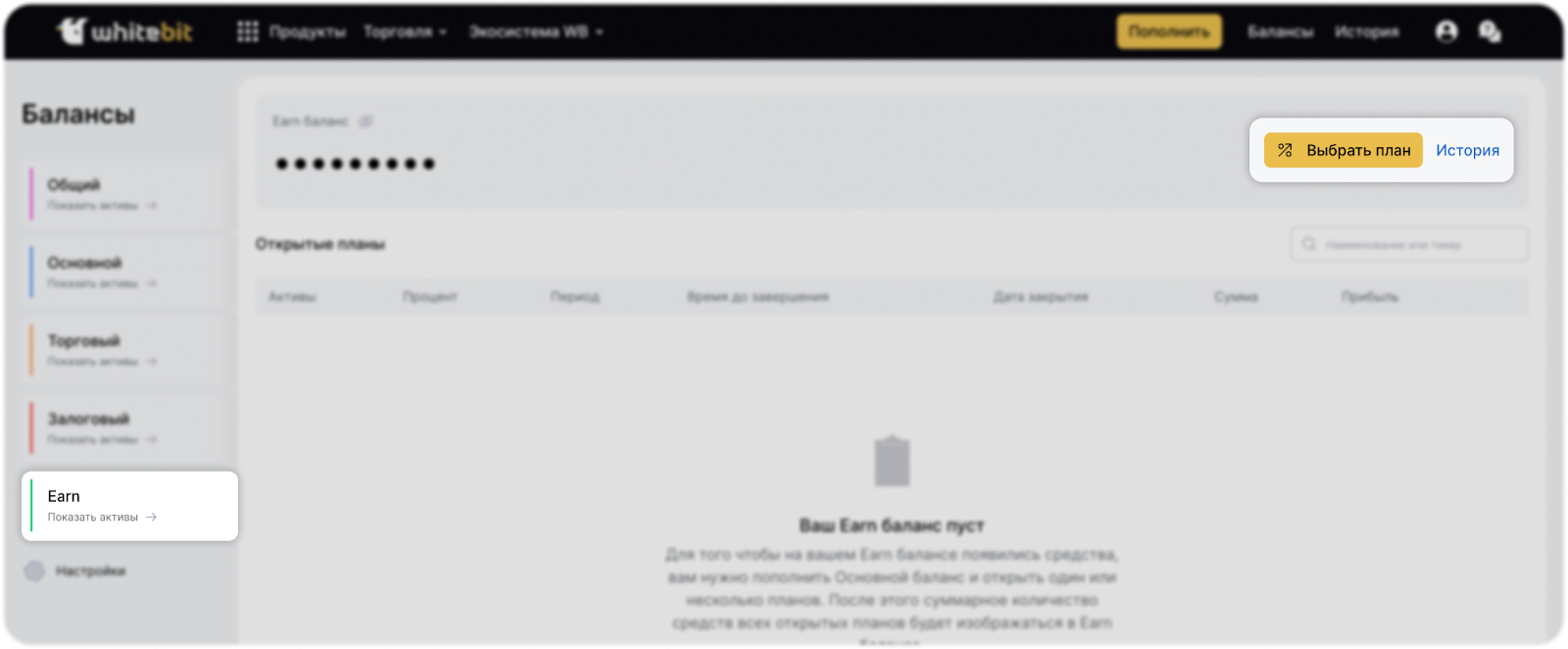 Earn баланс предназначен для хранения и отображения средств, используемых для Криптодепозита. Соответственно, вы сможете увидеть данные на этой странице только при условии активного криптодепозитного плана. После закрытия плана сумма вместе с прибылью начисляется на Основной баланс.