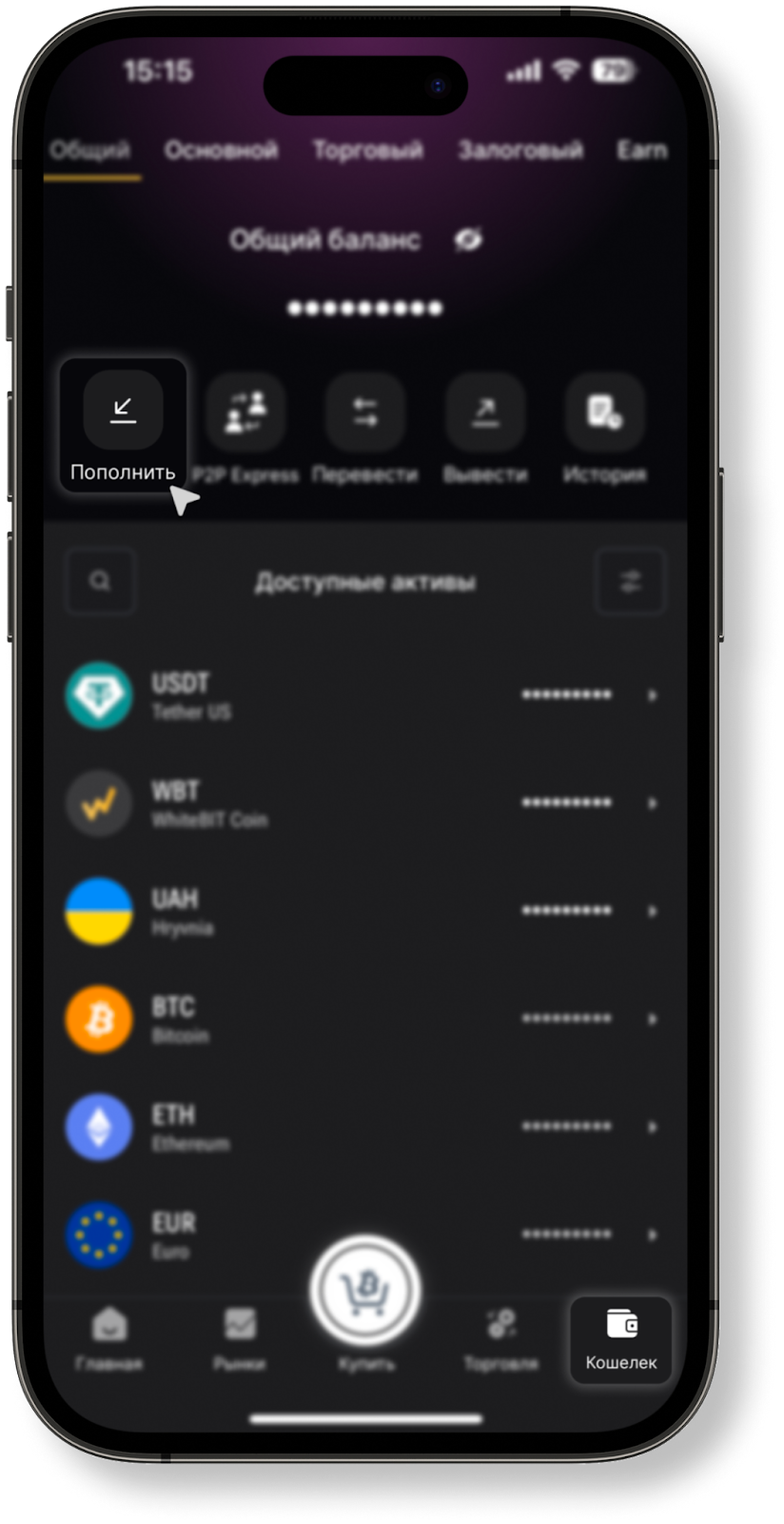 Откройте главную страницу приложения WhiteBIT и нажмите на кнопку «Пополнение». Вы также можете перейти к форме пополнения через вкладку «Кошелек» — «Пополнить».