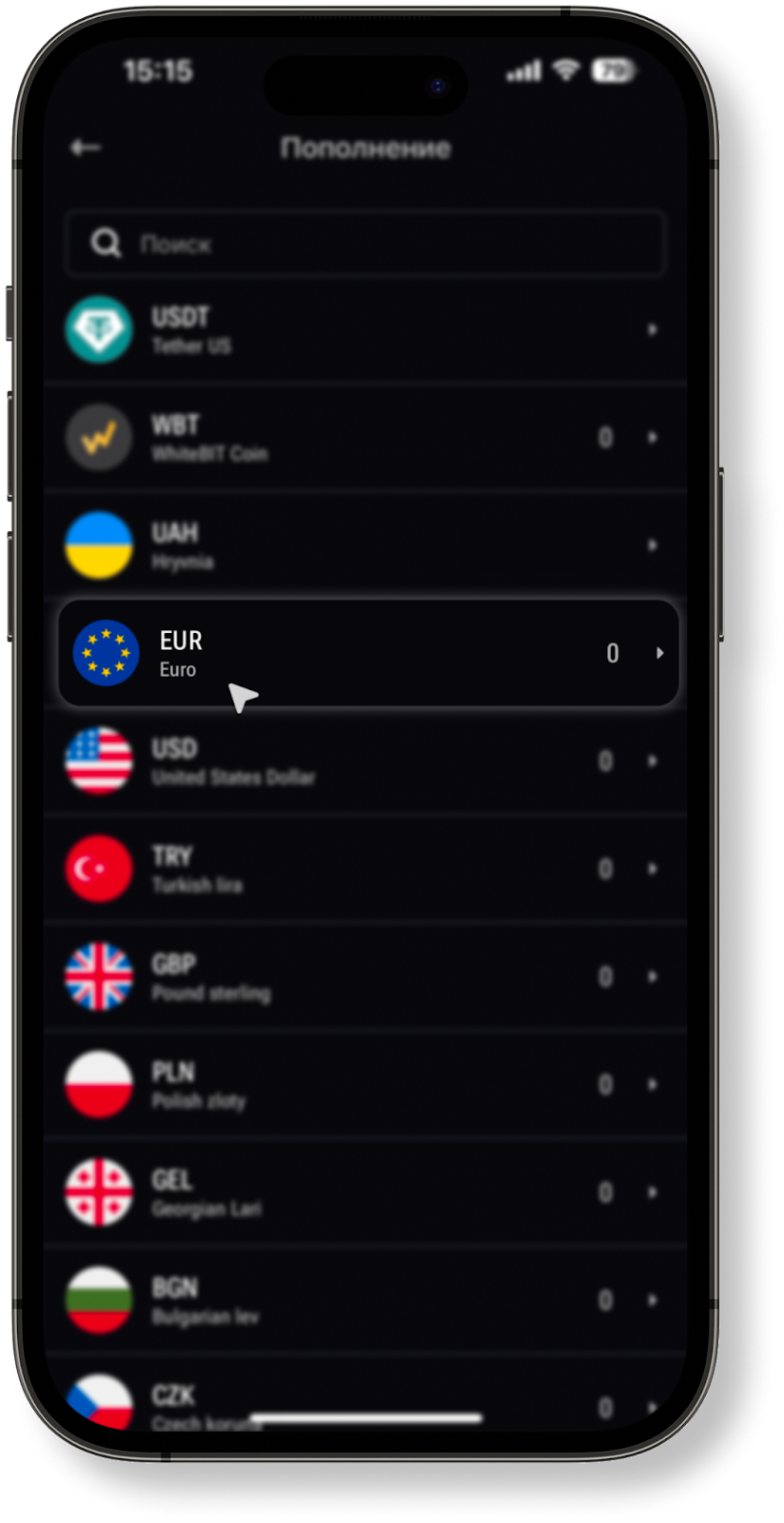 Найдите в списке валюту, которую вы желаете пополнить, либо введите тикер государственной валюты в строке поиска, а затем нажмите на него.