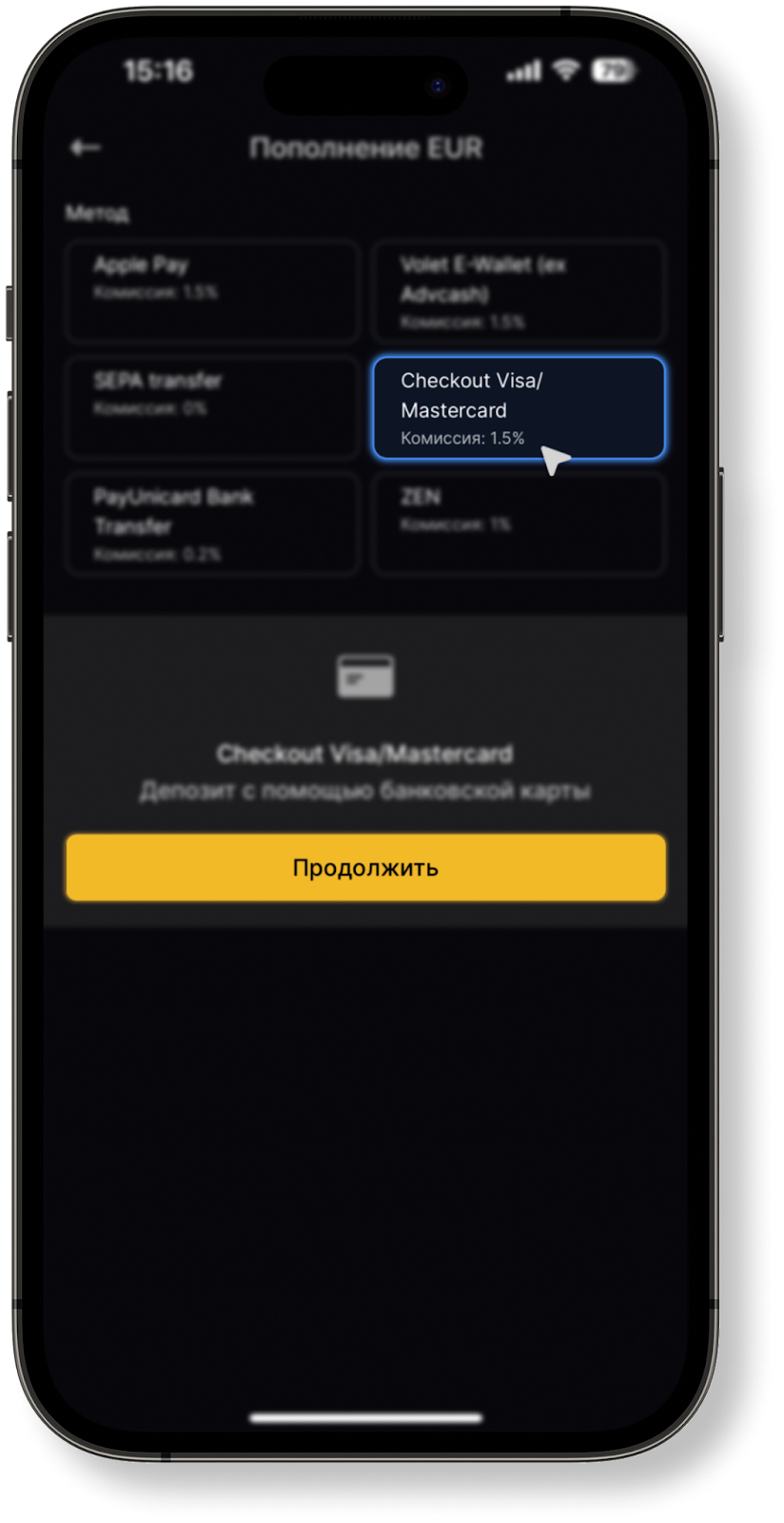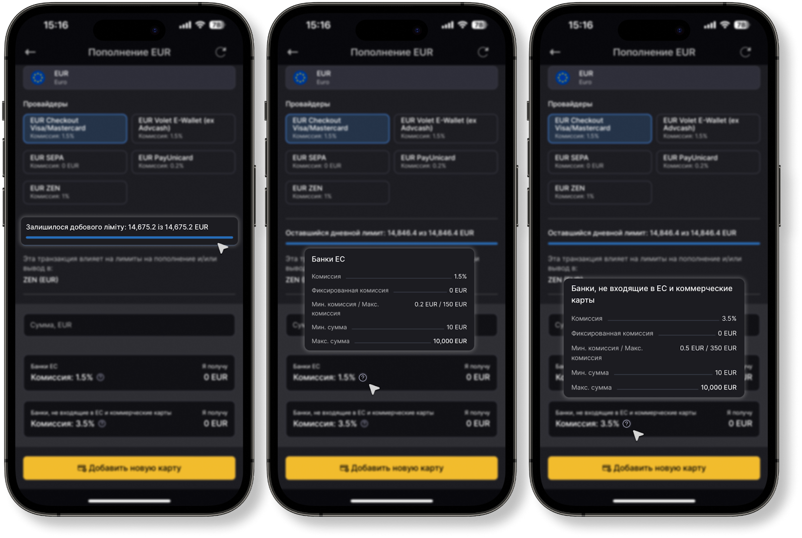 Все комиссии и лимиты при пополнении, а также доступные провайдеры отображены на странице Комиссий.