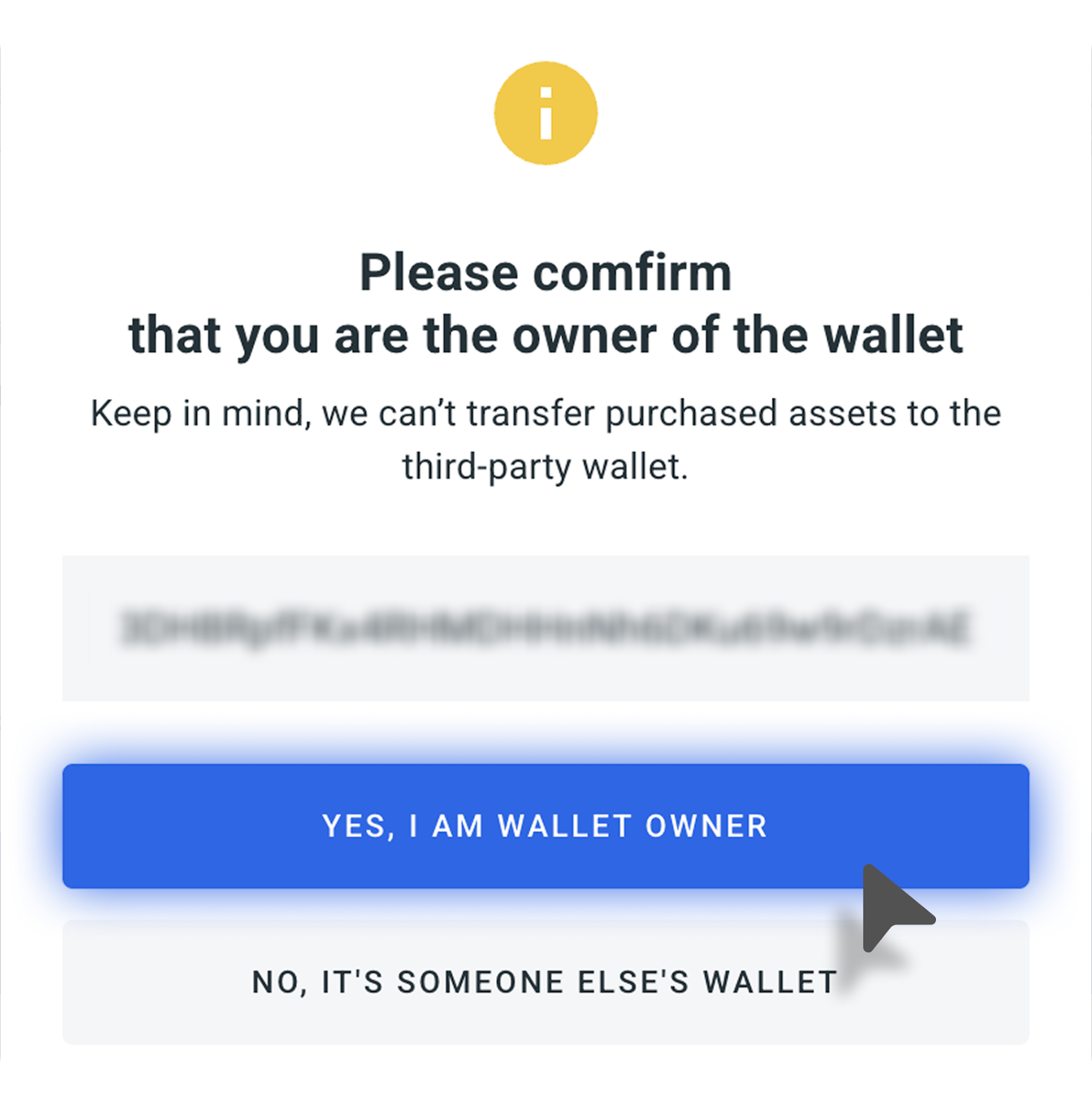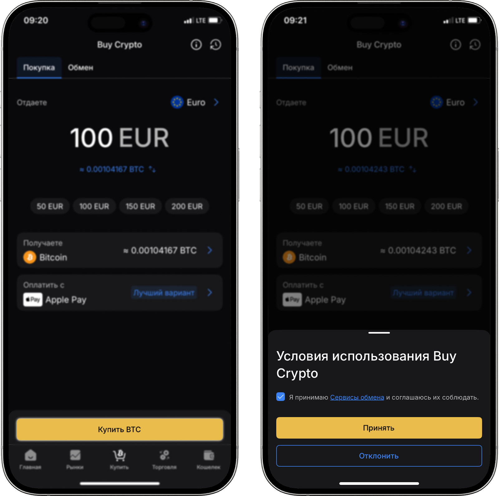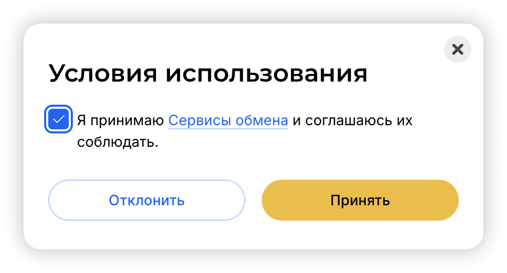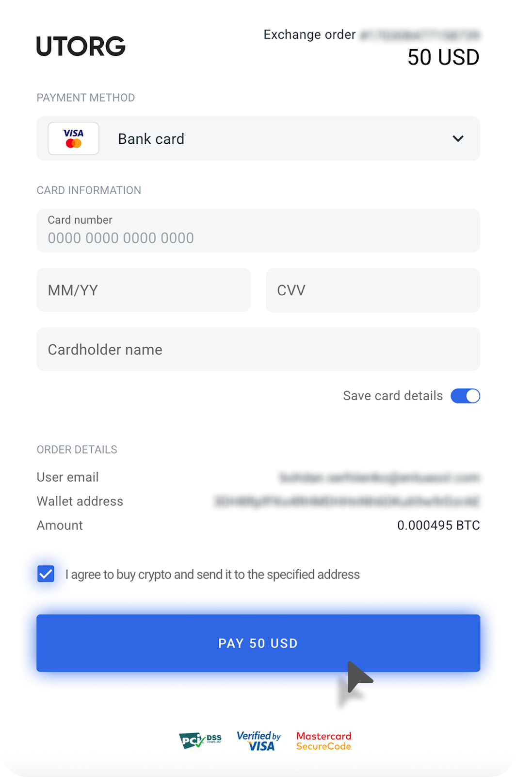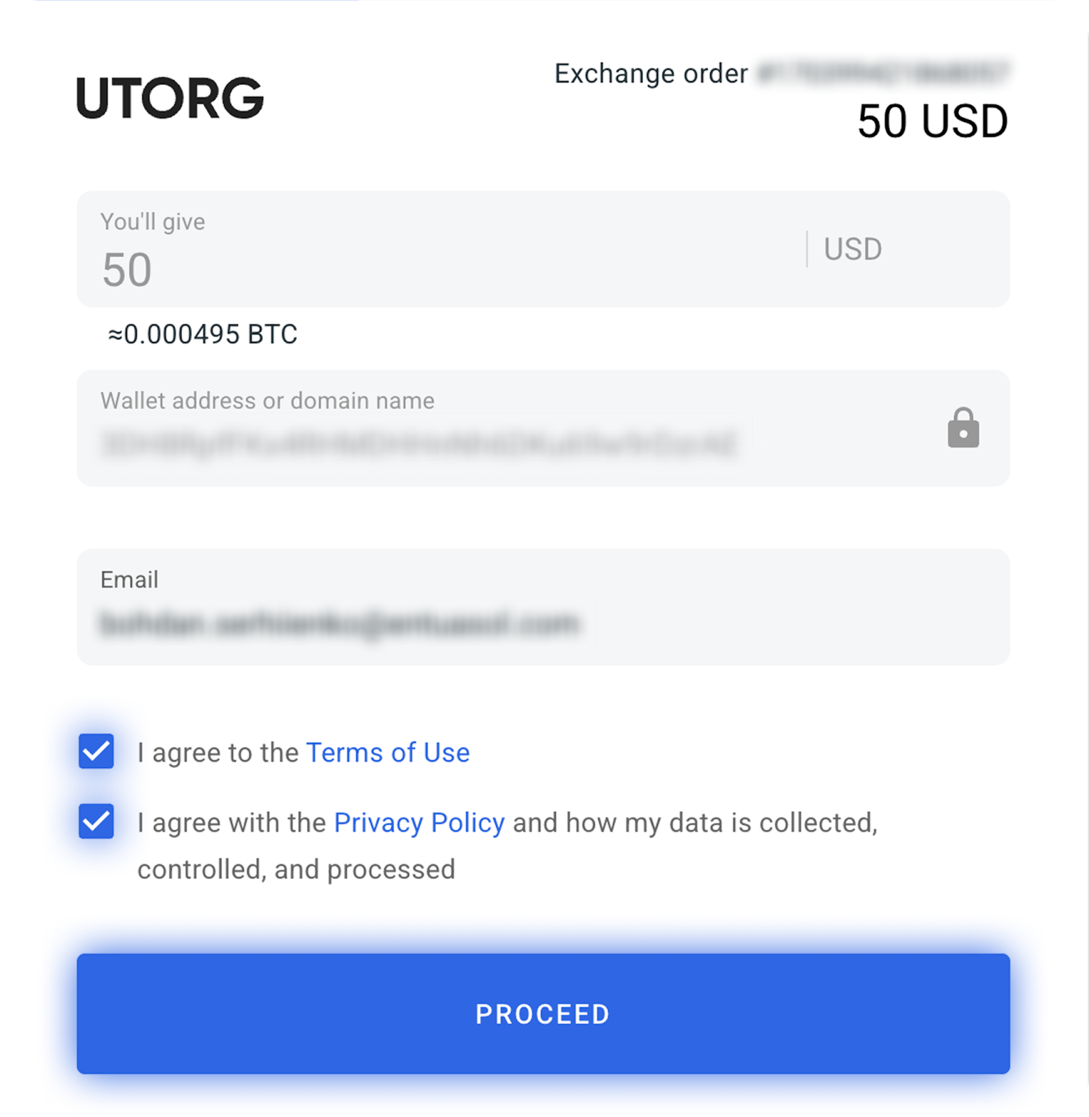 - На следующем этапе откроется окно с деталями вашей транзакции (сумма оплаты, сумма криптовалюты, которую вы получаете на баланс, и сумма комиссии). Вам нужно будет согласиться с Условиями использования сервиса, Политикой конфиденциальности и подтвердить покупку. Также нужно подтвердить, что вы являетесь владельцем кошелька и вашу электронную почту, введя одноразовый код.