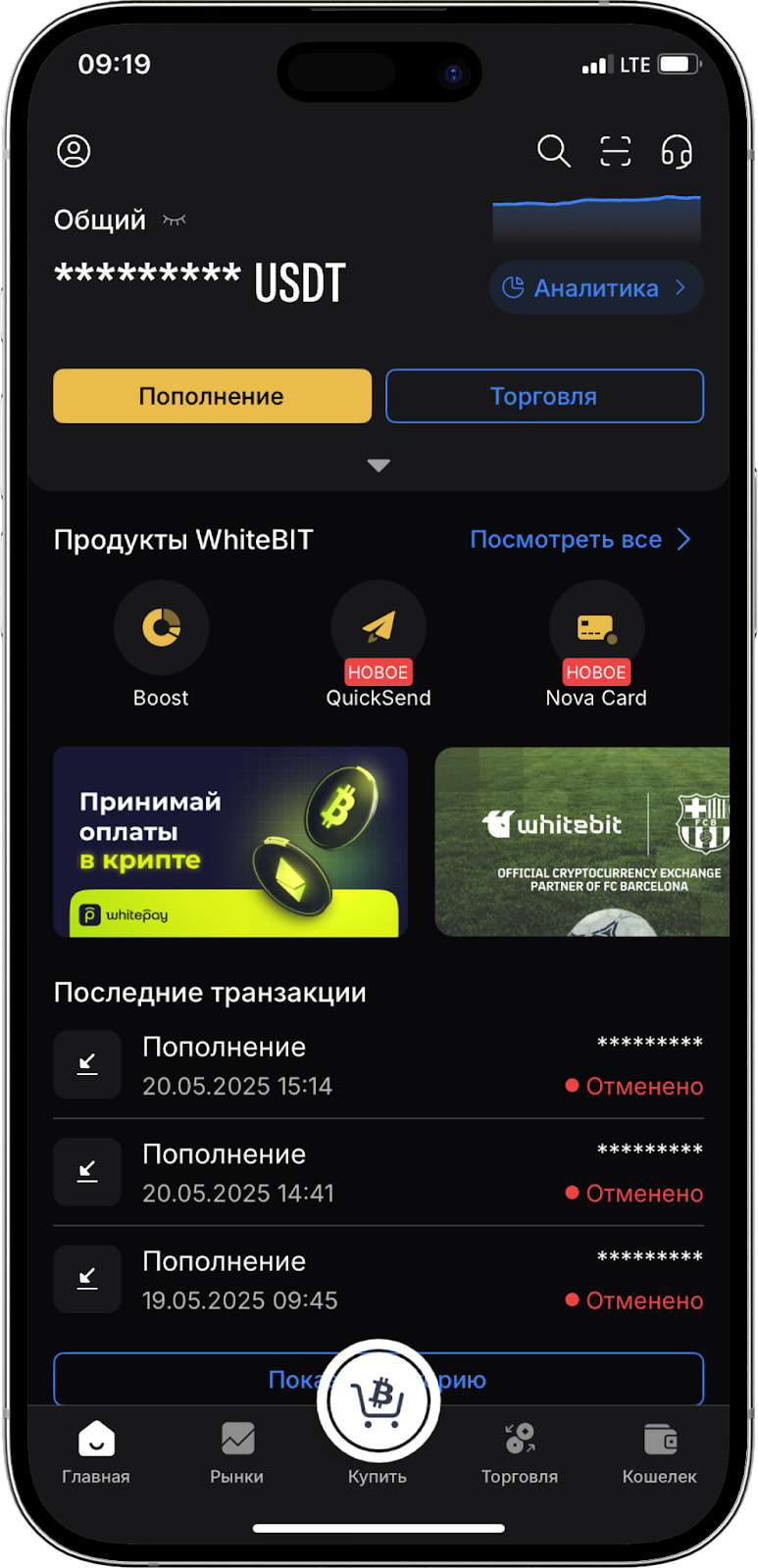 в правом нижнем углу экрана (в приложении WhiteBIT в правом верхнем углу нажмите