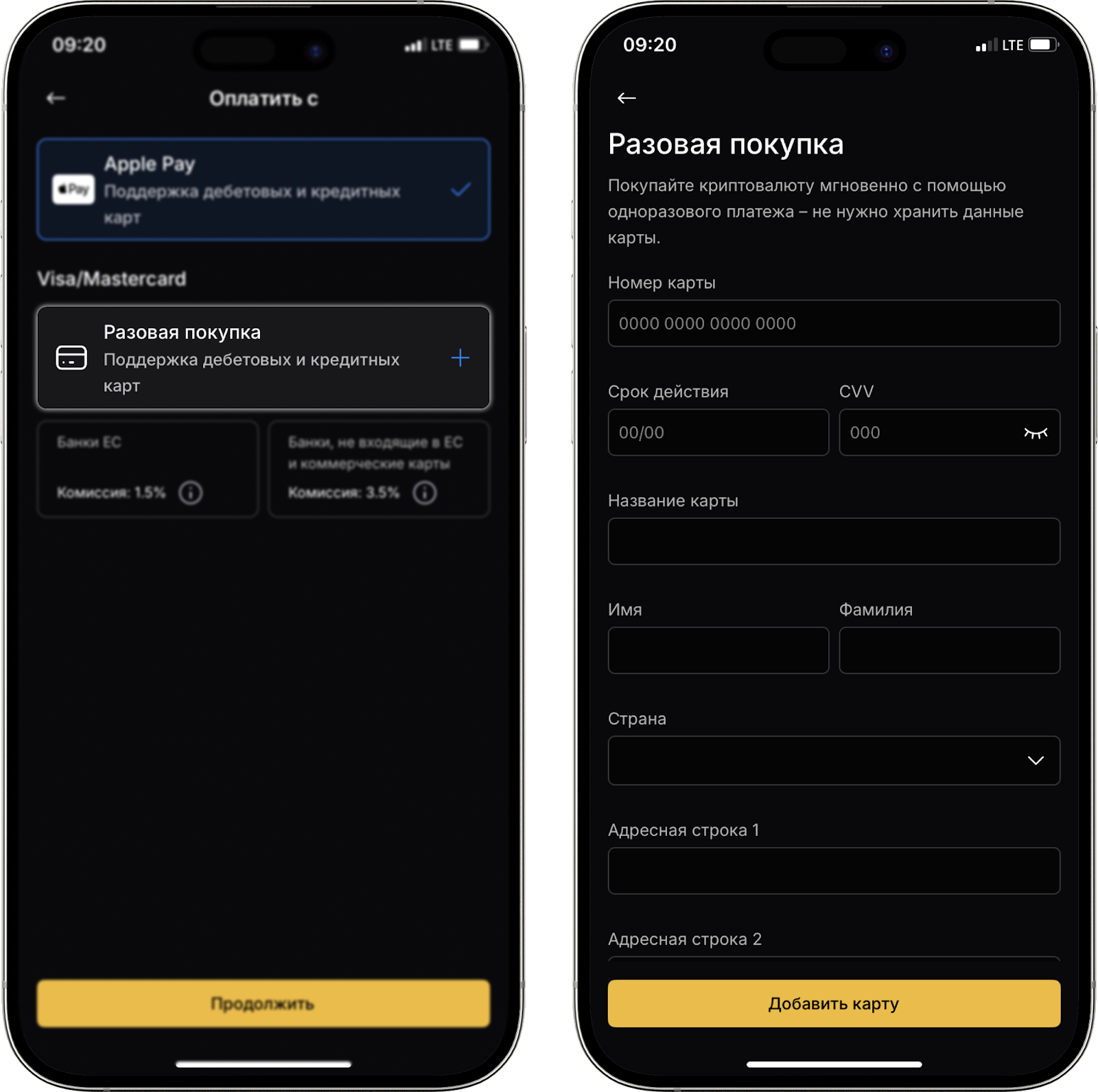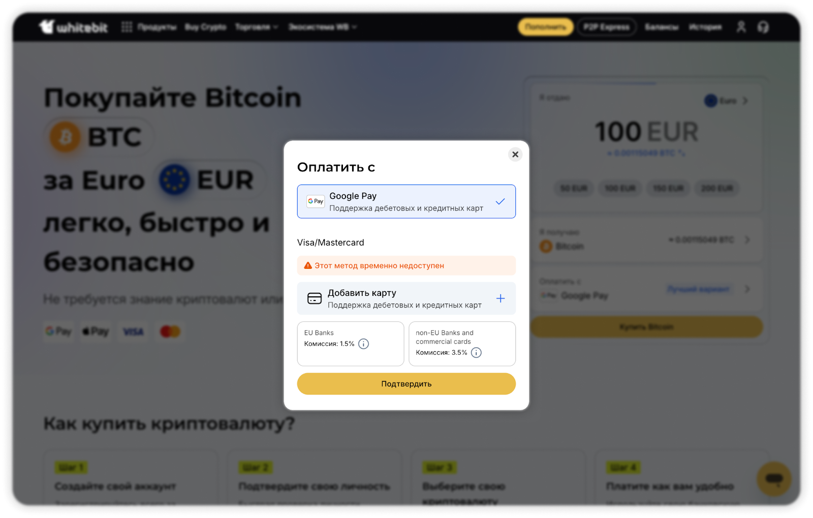 - Выберите метод оплаты Apple Pay/Google Pay или Visa/Mastercard.