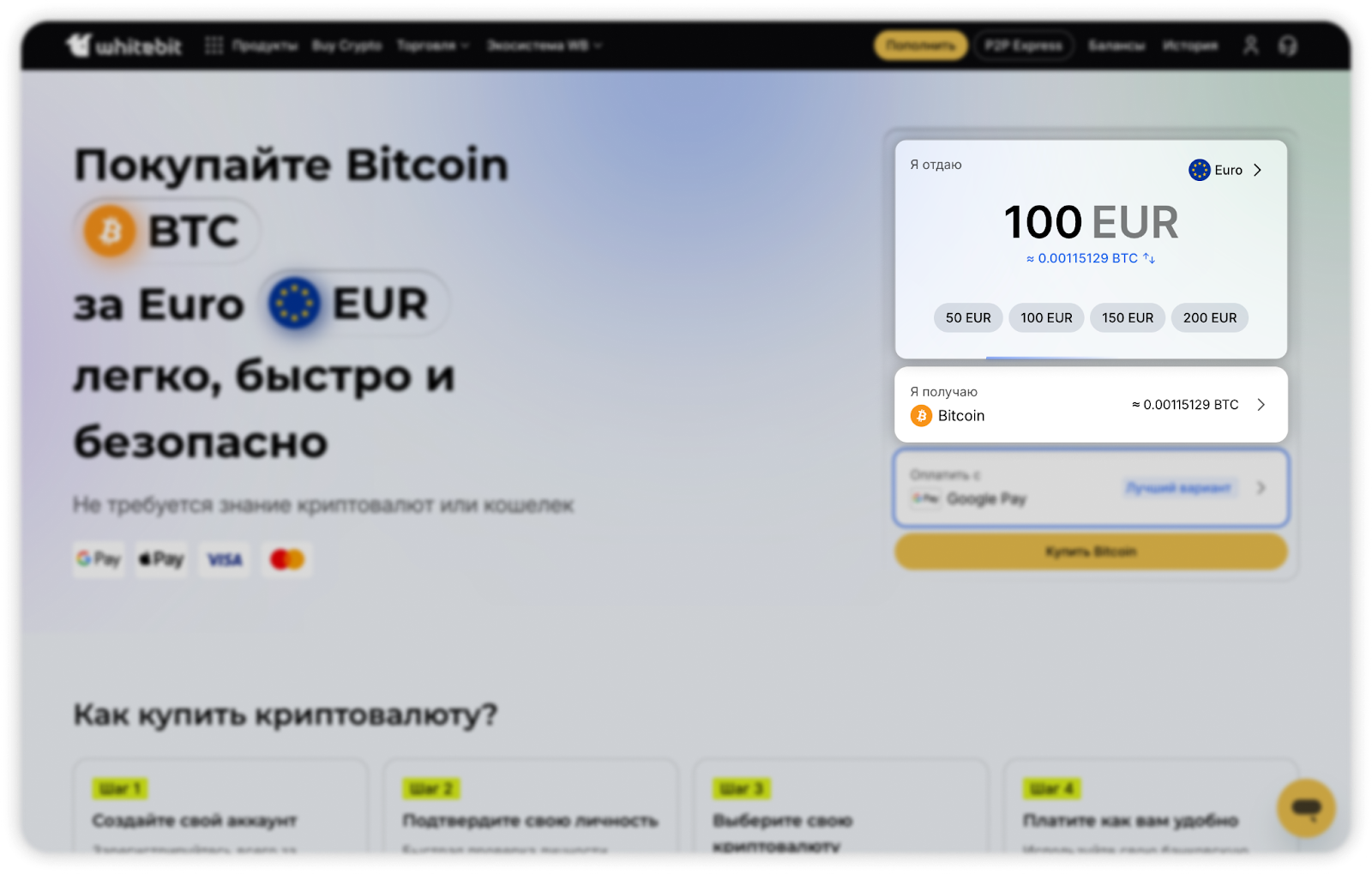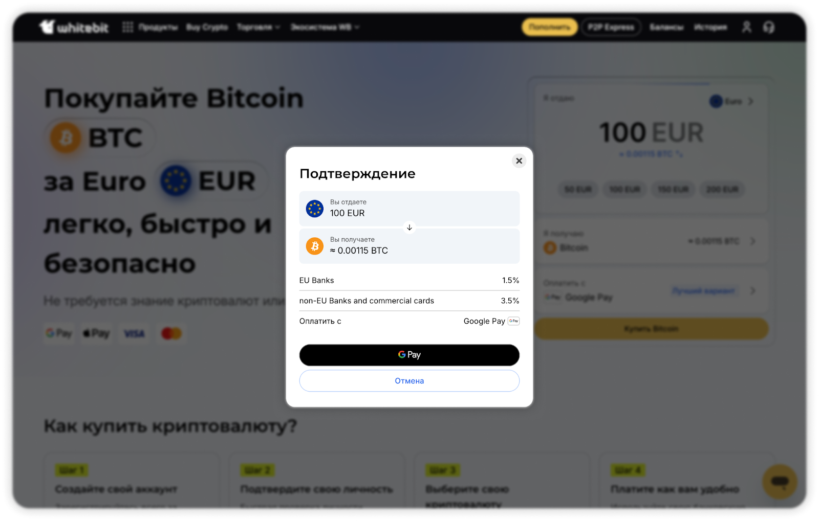 - В появившемся окне вам нужно выбрать валюту для оплаты (EUR, USD, PLN, CZK, GBP), указать желаемую сумму и выбрать криптовалюту, которую хотите купить. Вы сразу увидите, какое количество криптовалюты вы получите за указанную сумму для оплаты по актуальному курсу.