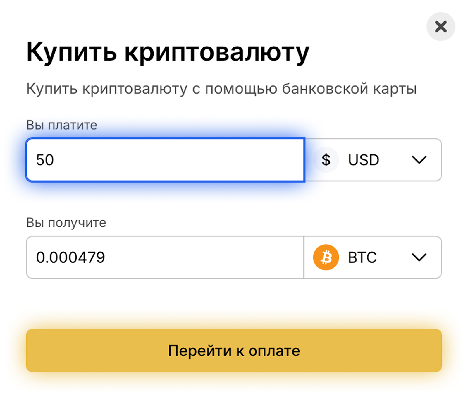 - В появившемся окне вам нужно выбрать валюту для оплаты, указать желаемую сумму и выбрать криптовалюту, которую хотите купить. Вы сразу увидите, какое количество криптовалюты вы получите за указанную сумму для оплаты по актуальному курсу. Нажмите “Перейти к оплате”.