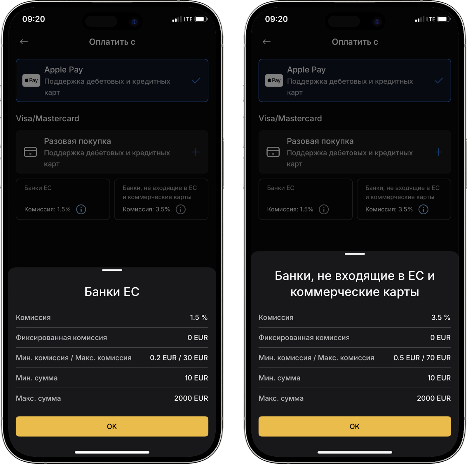 - Под методами оплаты вы можете ознакомиться с комиссиями. Комиссия при оплате методом Apple Pay/Google Pay и Visa/Mastercard составляет 1,5% для банков ЕС или 3,5% для банков стран, не входящих в ЕС, а также коммерческих карт.