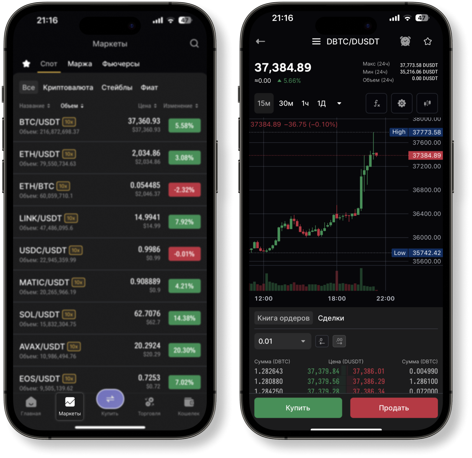 Кроме этого, вы можете воспользоваться вкладкой "Маркеты". Воспользуйтесь поиском, выберите доступную пару и нажмите на нее. Вас перенаправит на страницу с графиком. Там необходимо нажать "Купить" или "Продать".