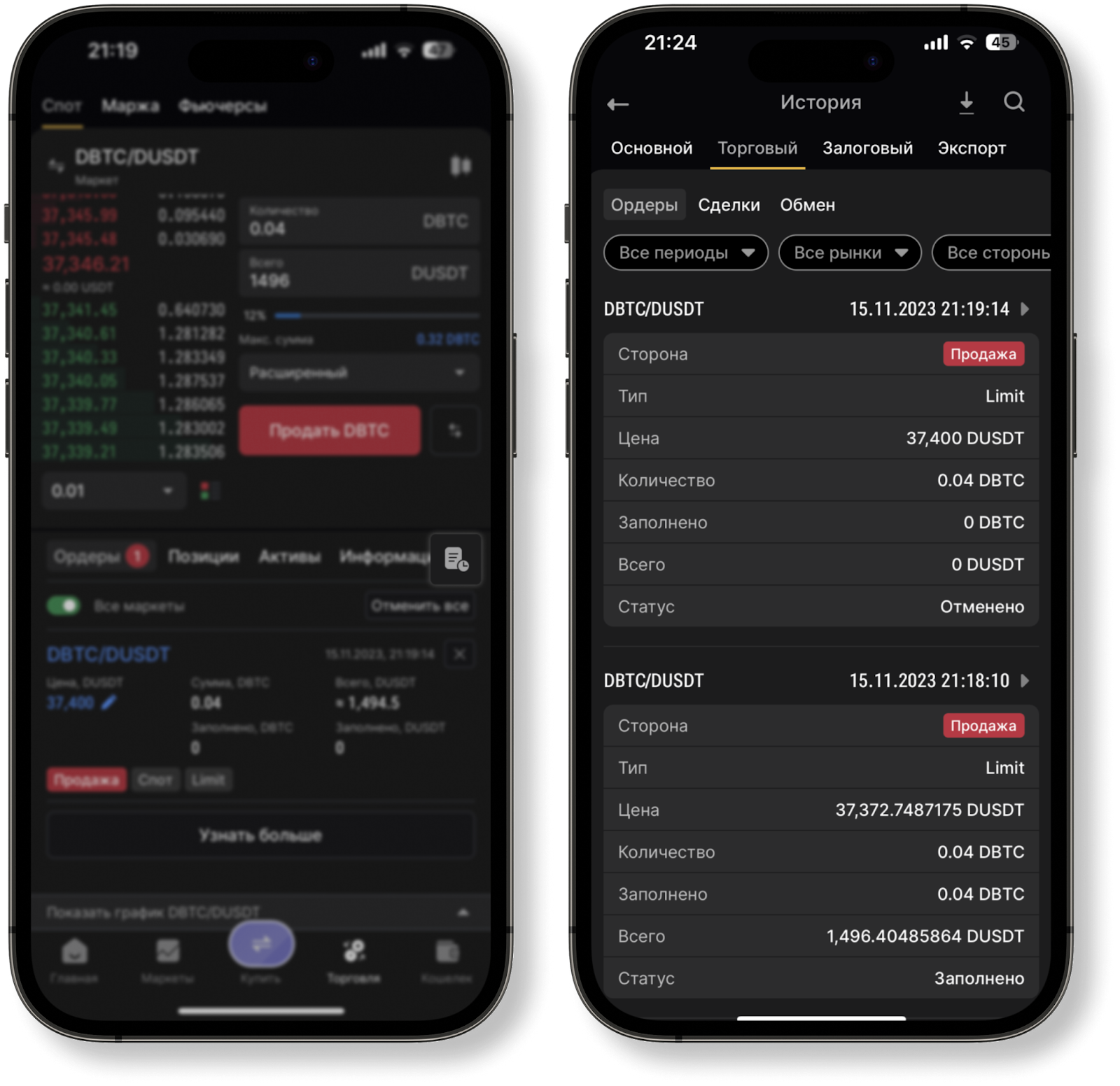 - С главной страницы приложения, нажав "История" - "Торговый" - "Ордеры".