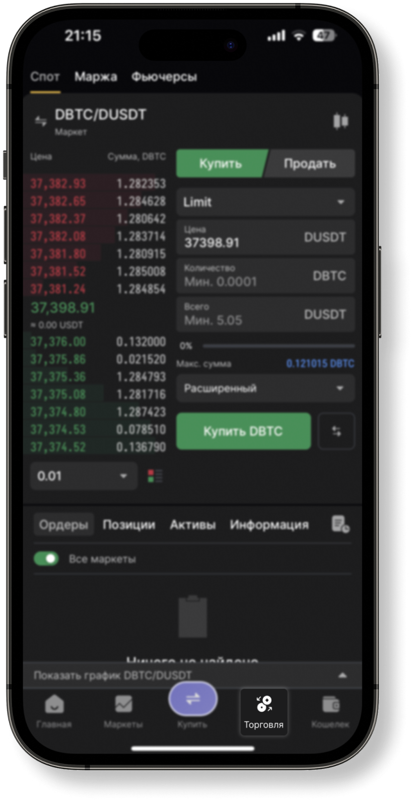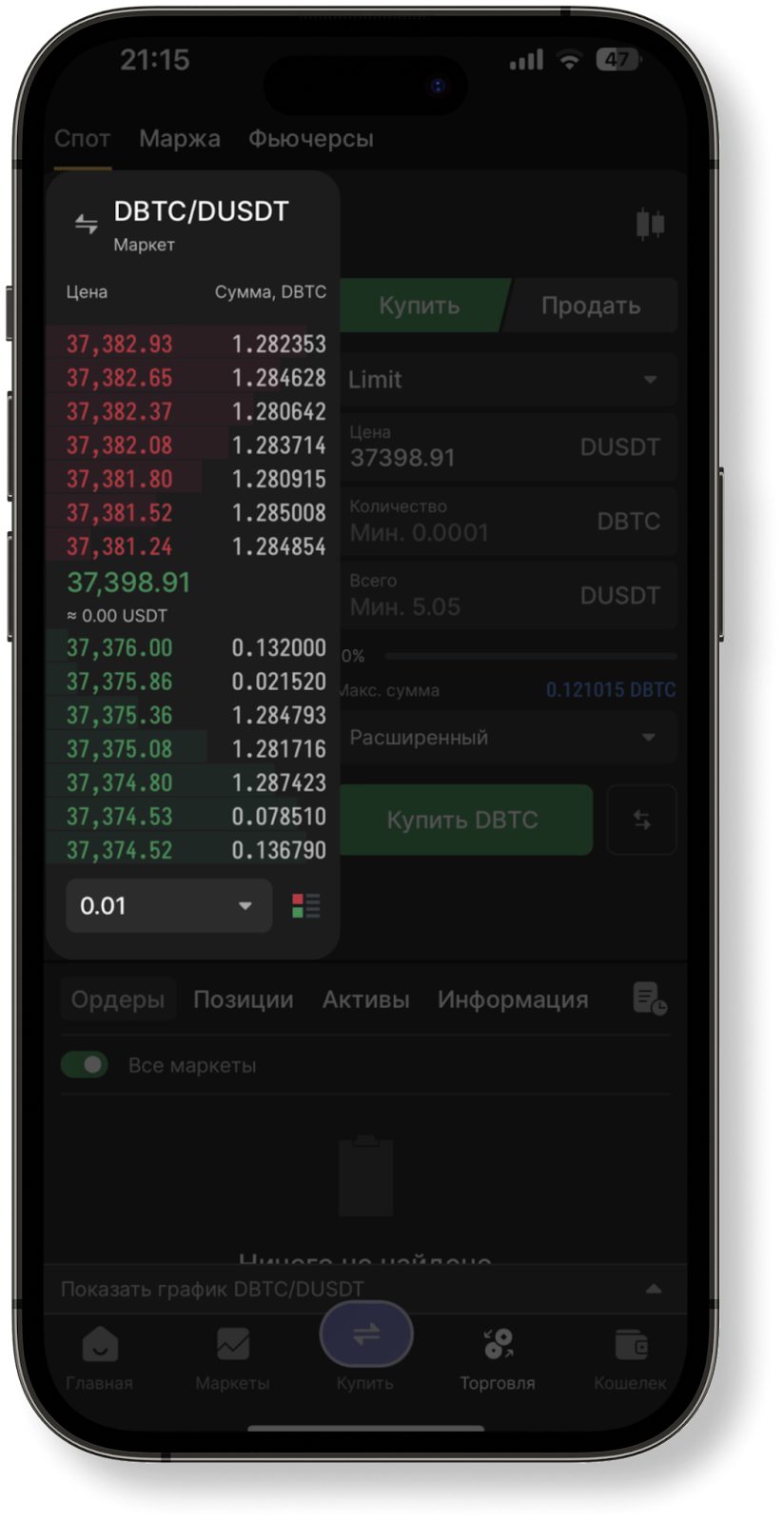 Для того чтобы выставить ордер в приложении, вам необходимо перейти в раздел "Торговля" в режиме "Биржа", и выбрать пару активов в нисходящем списке левой верхней части экрана.