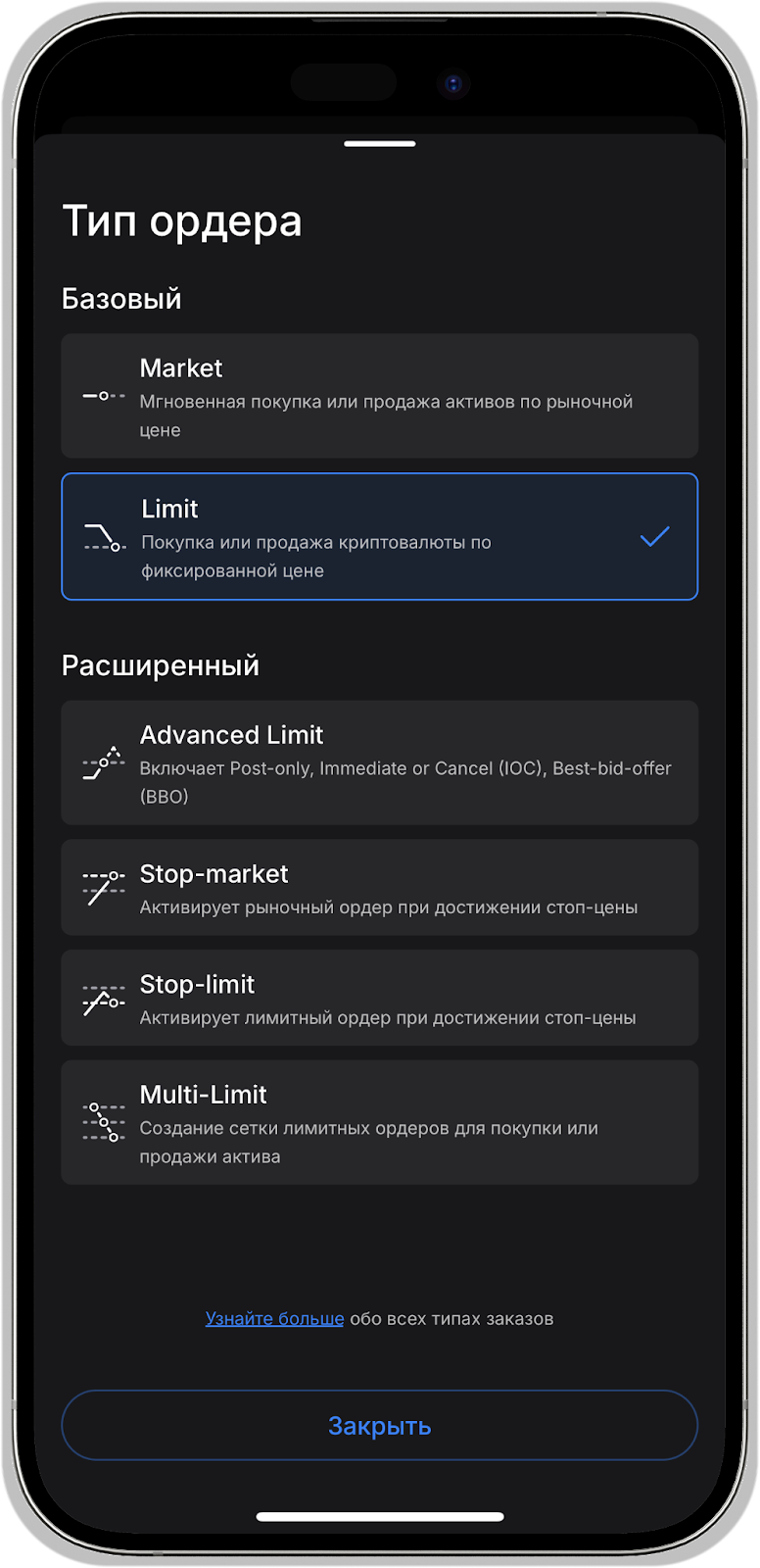 Расширенные: Advanced Limit, Stop-Market, Stop-Limit, Multi-Limit, OCO.