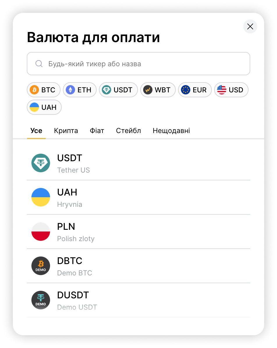 Зверніть увагу, що першими в списку відображаються валюти, які є у вас на балансі. Також під полем введення тікера або назви валюти ви можете побачити найпопулярніші валюти. Перейшовши у вкладку "Нещодавні" в цьому ж вікні, ви зможете одразу вибрати ту пару, в якій останнім часом робили обмін.