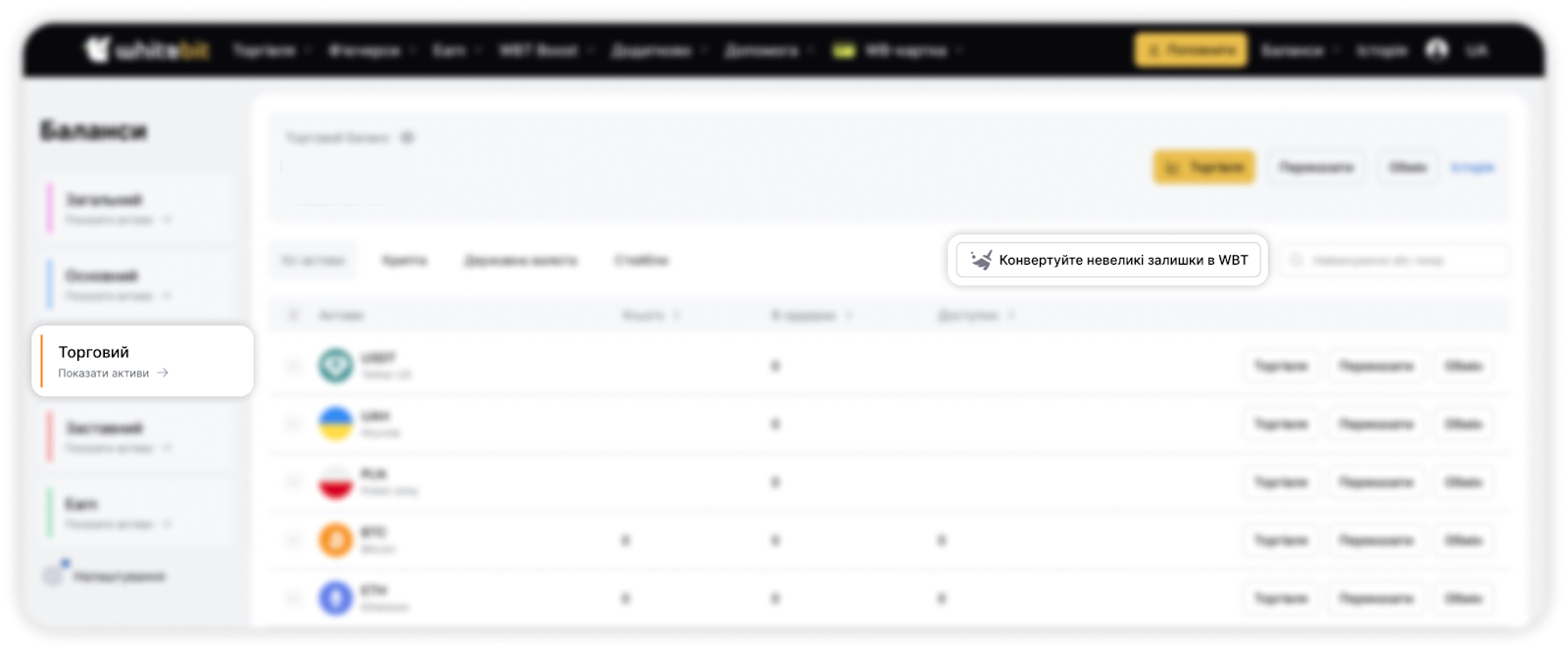 На сторінці Торгового балансу ви можете знайти функцію обміну будь-яких активів на суму менше 5 USDT в WBT.