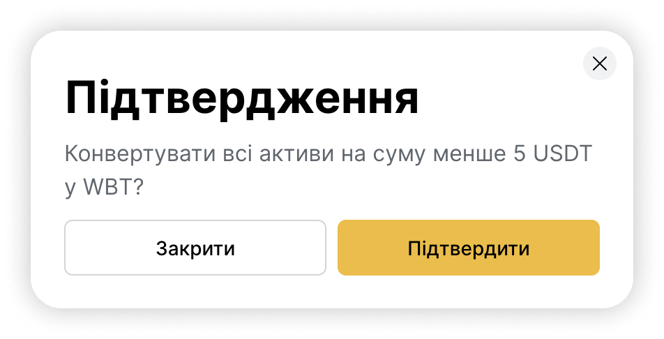 Ця кнопка розташована на верхній панелі біля поля пошуку тікера або назви. Натиснувши на неї, у вас відкриється вікно підтвердження. Після натискання кнопки "Підтвердити", відбудеться автоматичний обмін активів і отримані WBT відобразяться на вашому Торговому балансі.