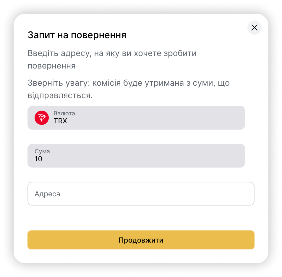 Зверніть увагу! Вказана вами для повернення коштів адреса не має належати нашій біржі. Також переконайтеся, що адреса вказана коректно, оскільки цей переказ не може бути скасованим чи перевідправленим після підтвердження.
