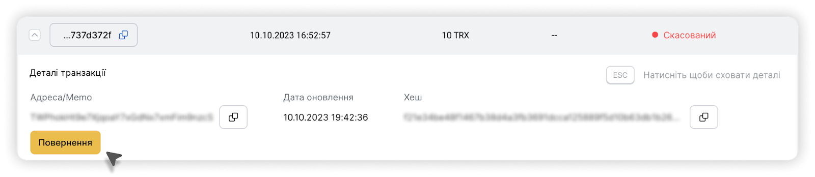 1. Відкрийте деталі відповідної транзакції та натисніть на кнопку "Повернення". Зверніть увагу, що ця кнопка буде доступна лише в окремому індивідуальному випадку і лише для транзакцій, стосовно яких буде прийнято рішення про можливість повернення.