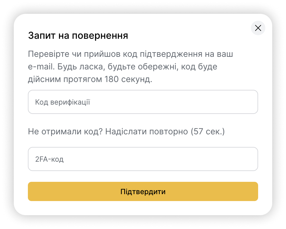 3. Підтвердьте створення заявки на "Refund". Вам прийде код на e-mail. Введіть його у відповідне поле у вікні підтвердження. Також необхідно ввести код 2FA (якщо функція увімкнена на акаунті).