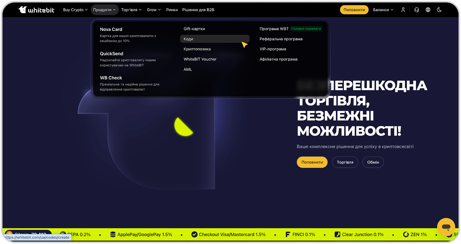 1. Перейдіть на сторінку "Коди" в розділі "Продукти" у верхньому меню на головній сторінці біржі.