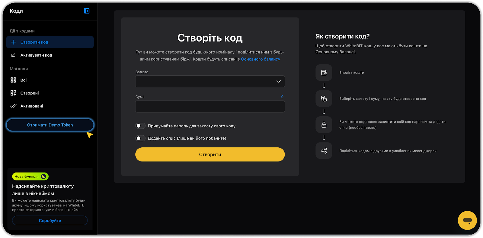 • Отримані від системи коди прив'язуються до вашого облікового запису. Тому, якщо ви поділитеся власним кодом для отримання Demo-токенів з іншим користувачем, цей код не працюватиме на його обліковому записі. Однак, після активації коду на власному обліковому записі, ви можете конвертувати його в новий WhiteBIT-код і поділитися ним з іншим користувачем і він зможе його активувати!