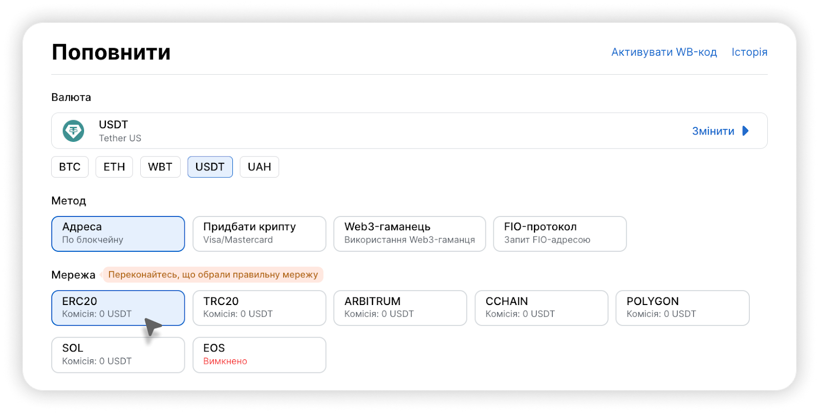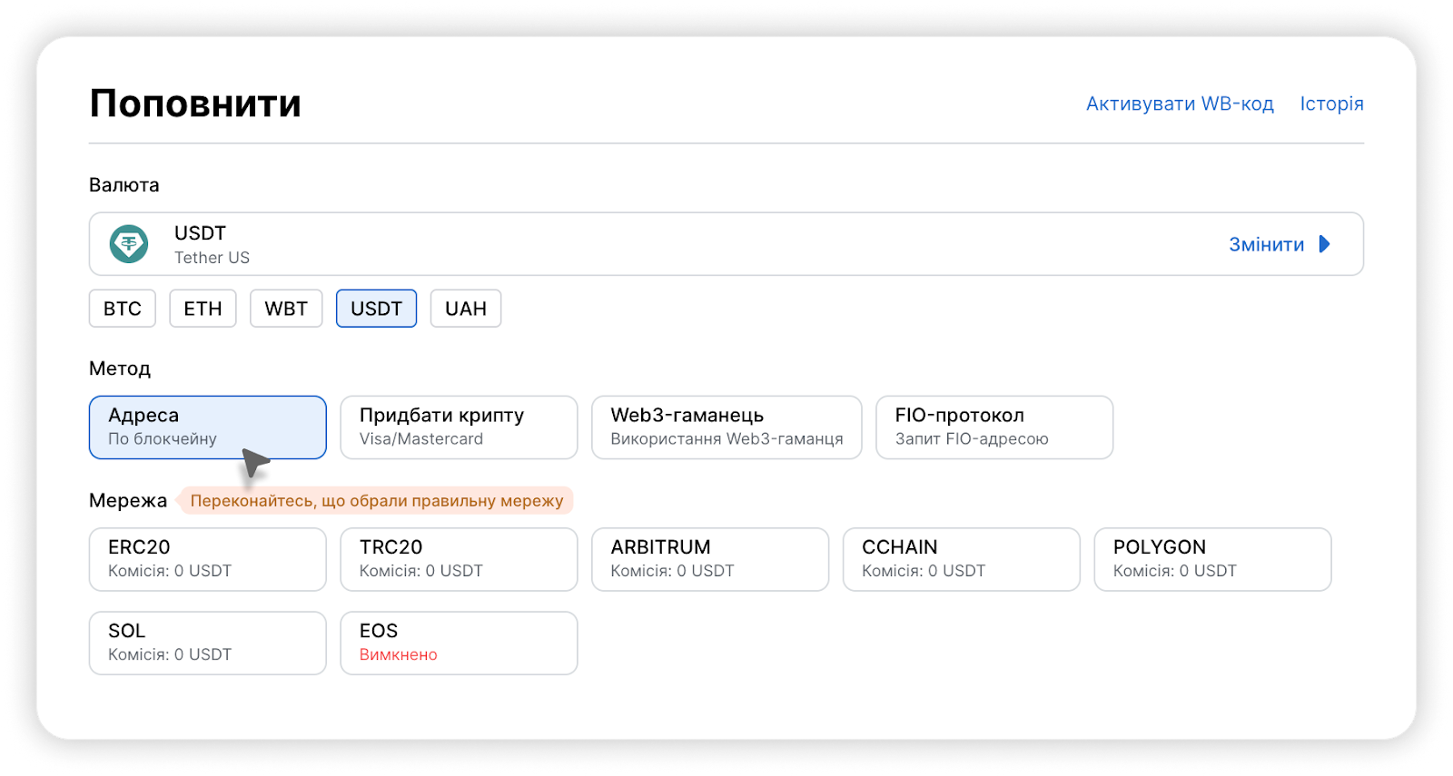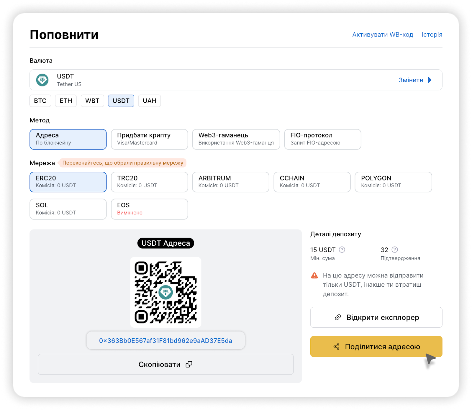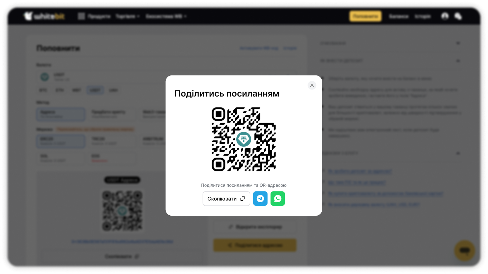 Зверніть увагу, що мережа відправника (стандарт токена), яку ви збираєтеся використовувати для поповнення, має відповідати мережі (стандарту токена) на біржі WhiteBIT.
