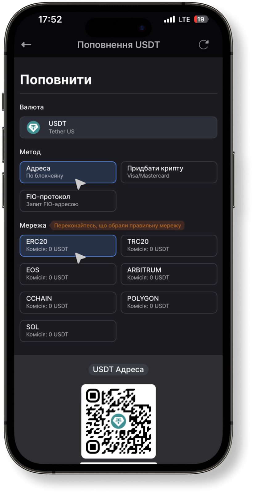 - Оберіть метод поповнення “Адреса” та мережу (якщо це потрібно). Перед цим переконайтесь, що ви дійсно обрали правильну мережу й вона є активною.