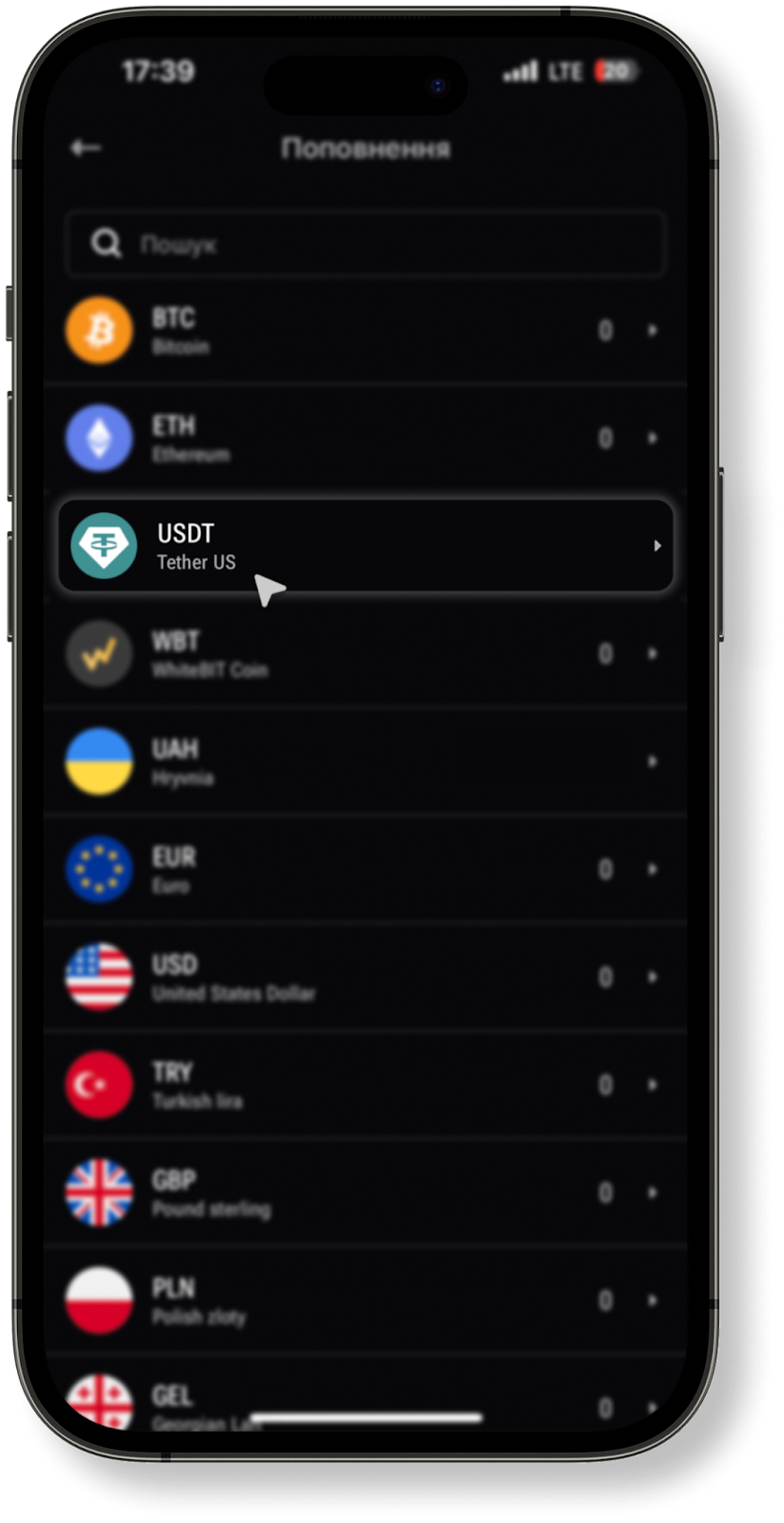 - Після натискання кнопки вам відкриється список монет, доступних для поповнення. Ви можете скористатися пошуком для того, щоб швидко знайти потрібний вам актив (у нашому випадку USDT).