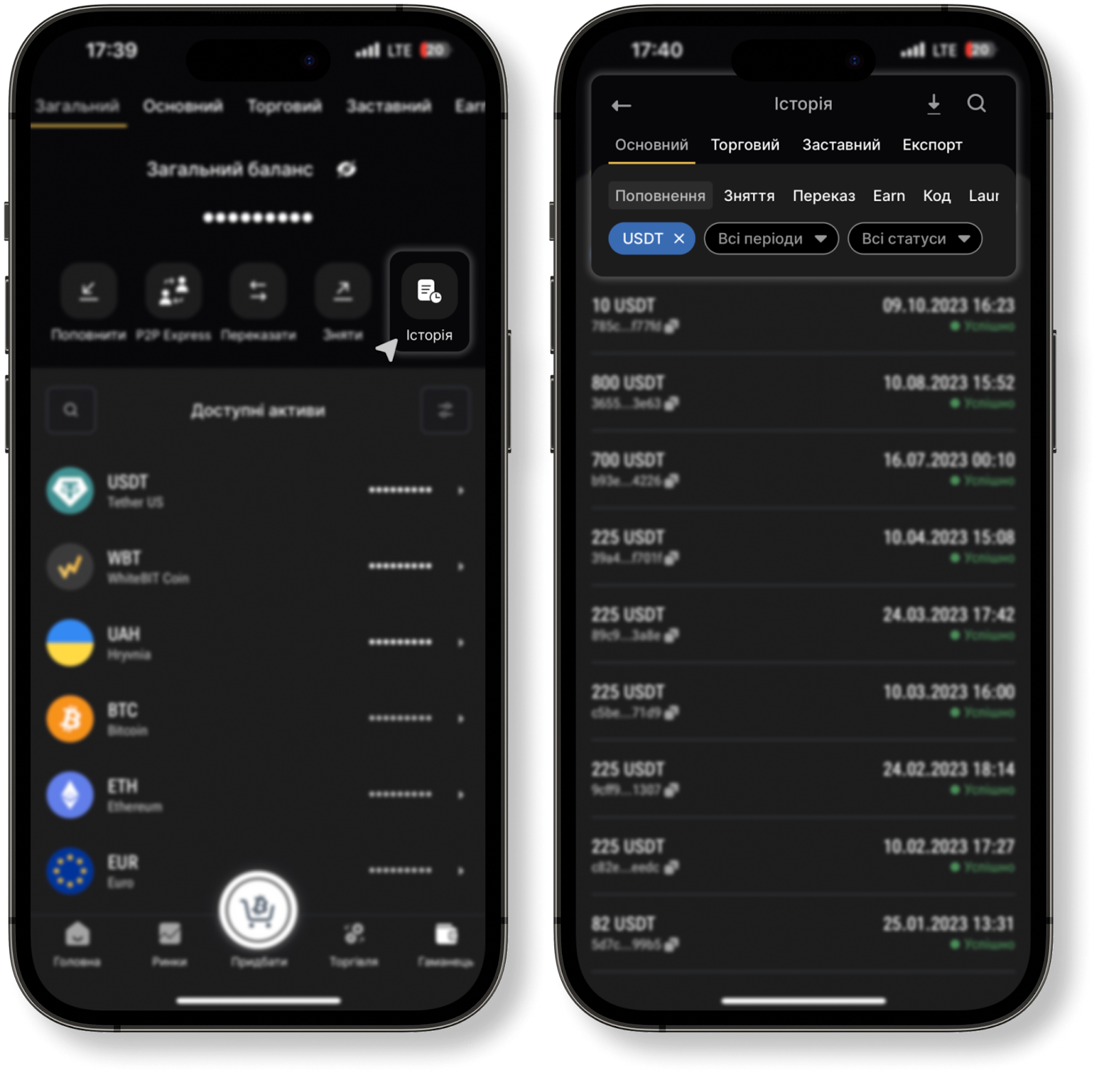 Ви можете переглянути усі деталі депозиту (статус, сума, дата, час, ID транзакції, розмір комісії, посилання на транзакцію в експлорері) у вкладці “Гаманець” – “Історія” у мобільному додатку біржі.