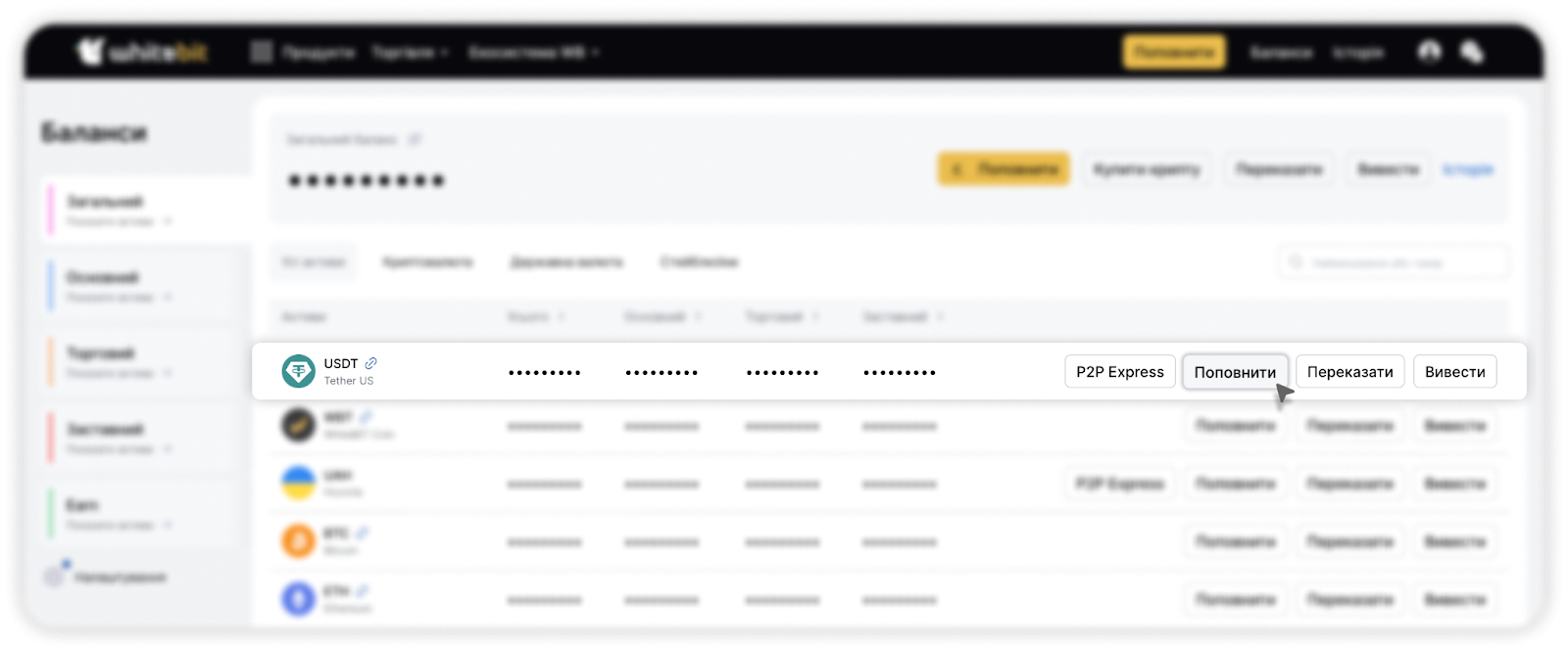- Перейдіть до вкладки "Баланси - Гаманець" у правому верхньому куті сайту та оберіть "Загальний" або "Основний". Натисніть кнопку “Поповнення”, що знаходиться навпроти тікера потрібного вам активу (у нашому випадку USDT).