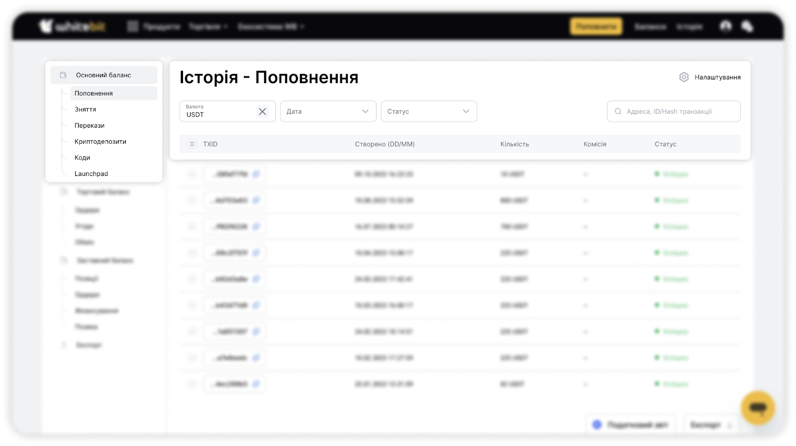 Деталі (сума, дата, час, ID транзакції, розмір комісії, посилання на транзакцію в експлорері) та статус вашого депозиту будуть відображатися у вкладці “Історія”–“Поповнення”.
